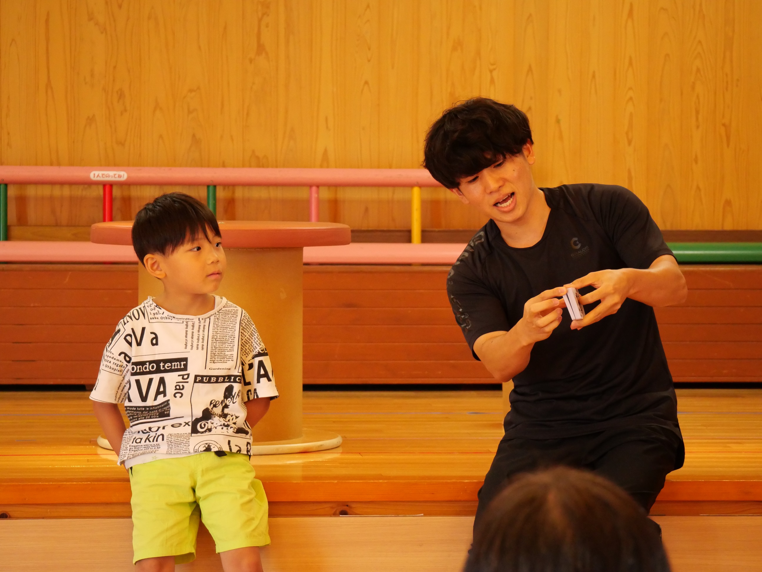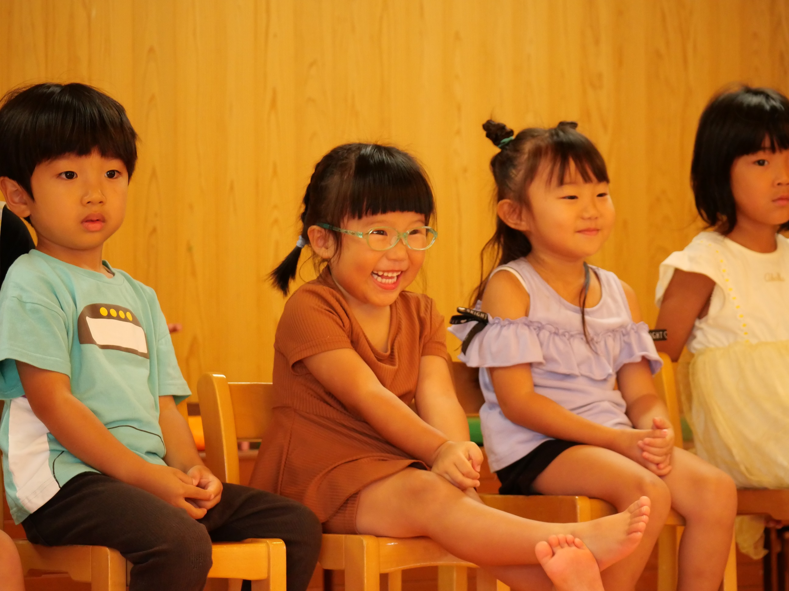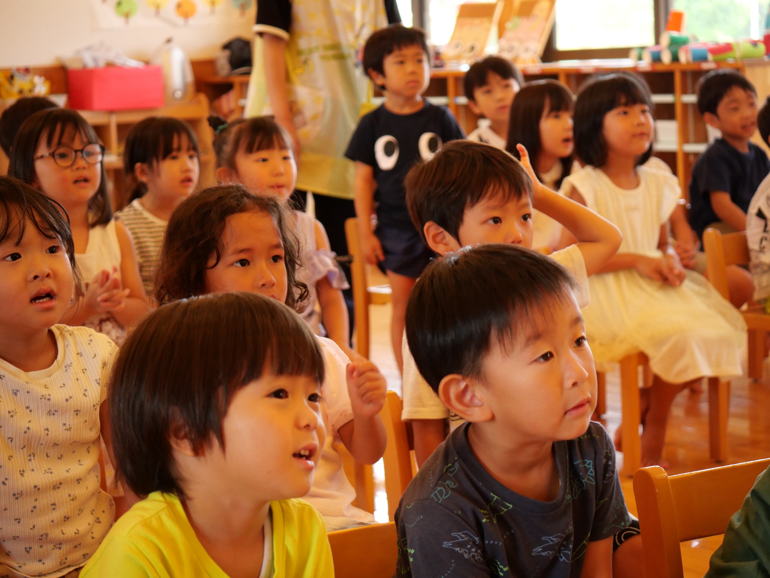 今月の誕生会は山崎保育園のマジシャン(笑)が登場!!みんな目を輝かせながらどんなことするんだろう~とワクワクしながら見ましたよ。笑ったり驚いたりと大盛り上がりでした。