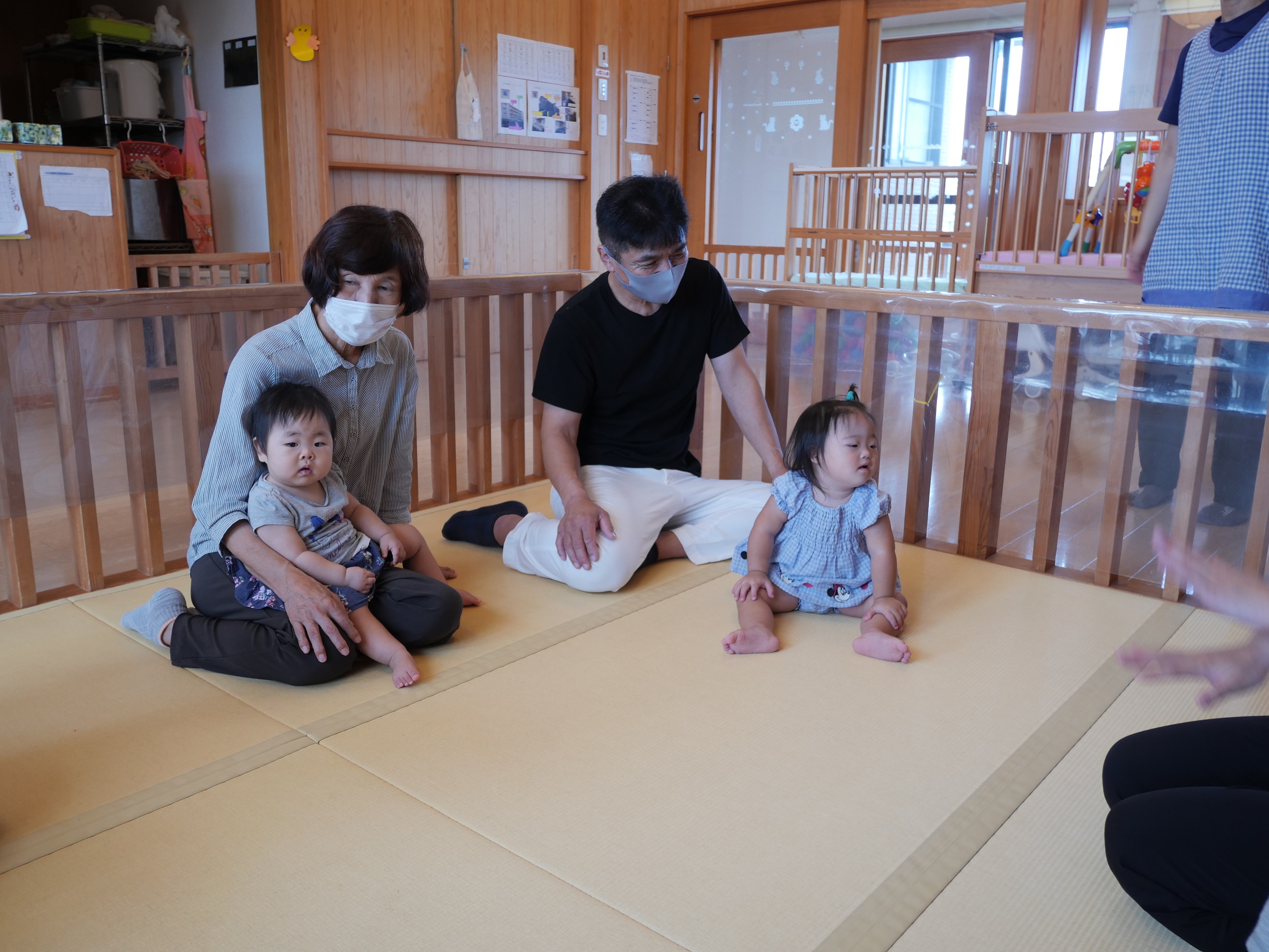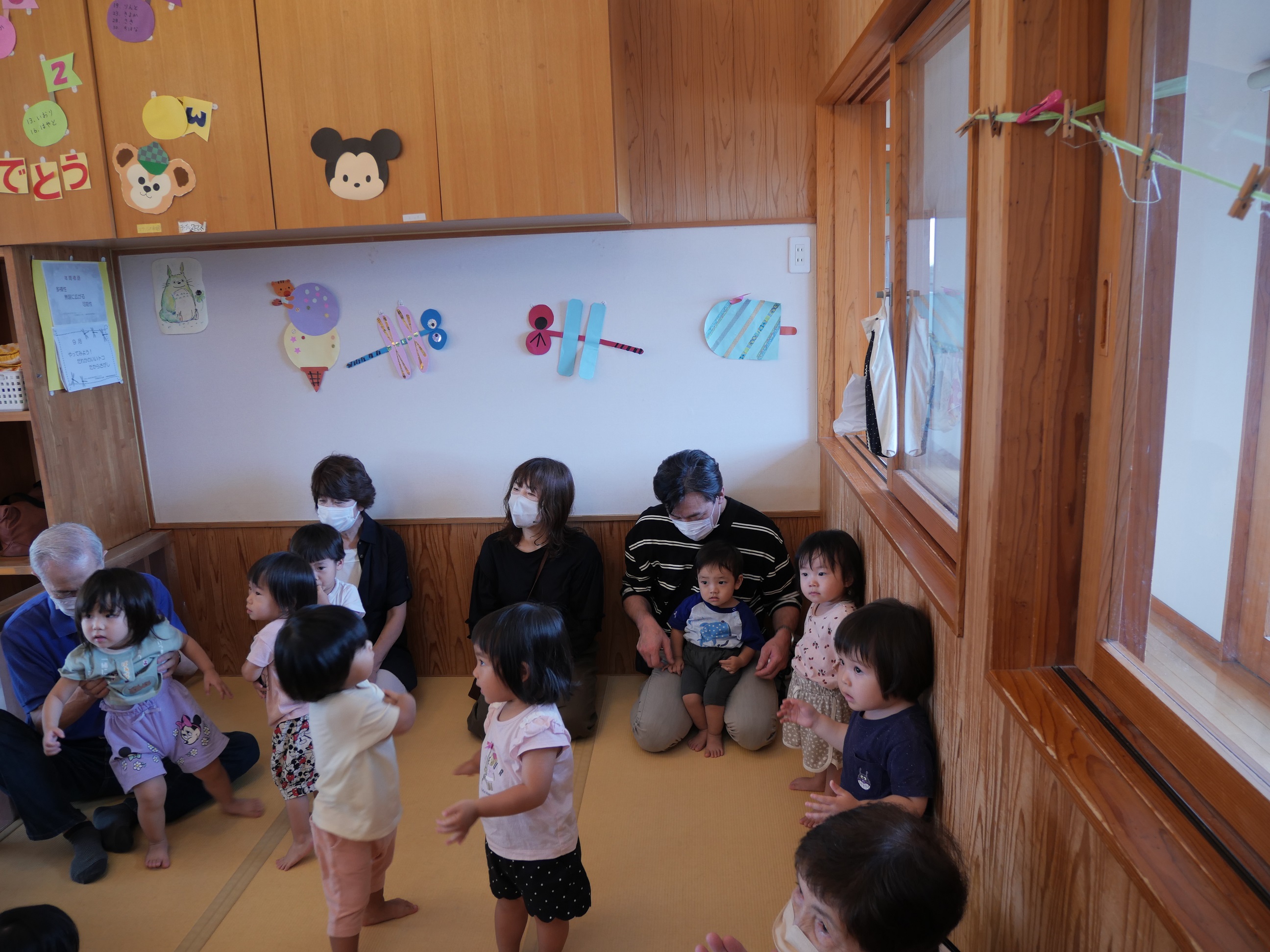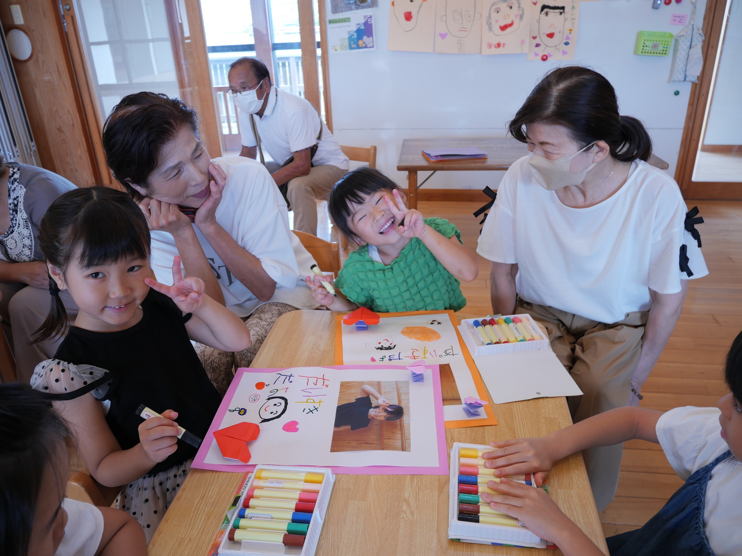 今日は大すきなおじいちゃん、おばあちゃんが来園され一緒に歌をうたったり、遊んだり、製作をして楽しみました。おじいちゃん、おばあちゃんの顔もニコニコ。園児たちも「見ててね」と得意気です。また一緒にあそぼうね♪