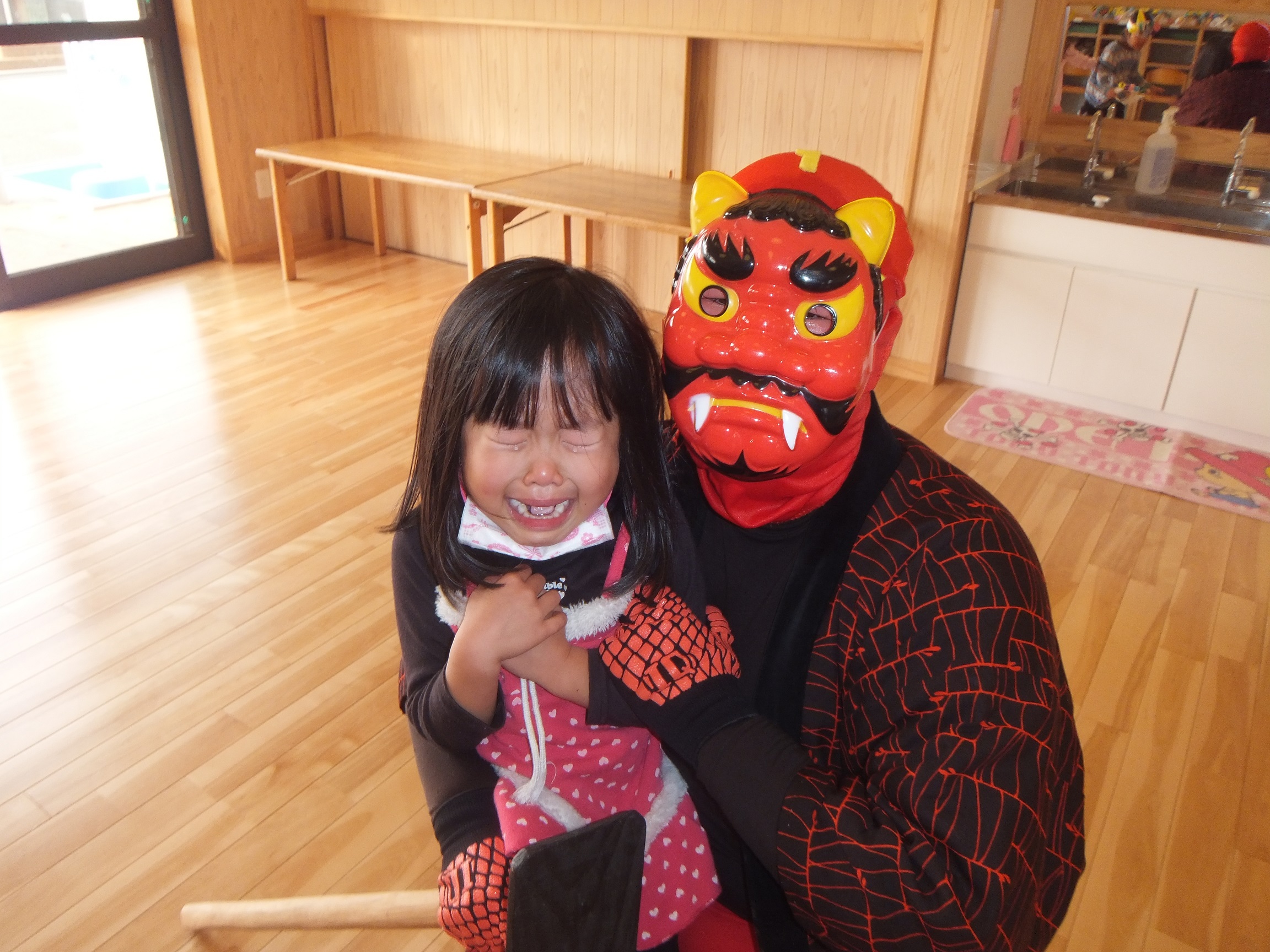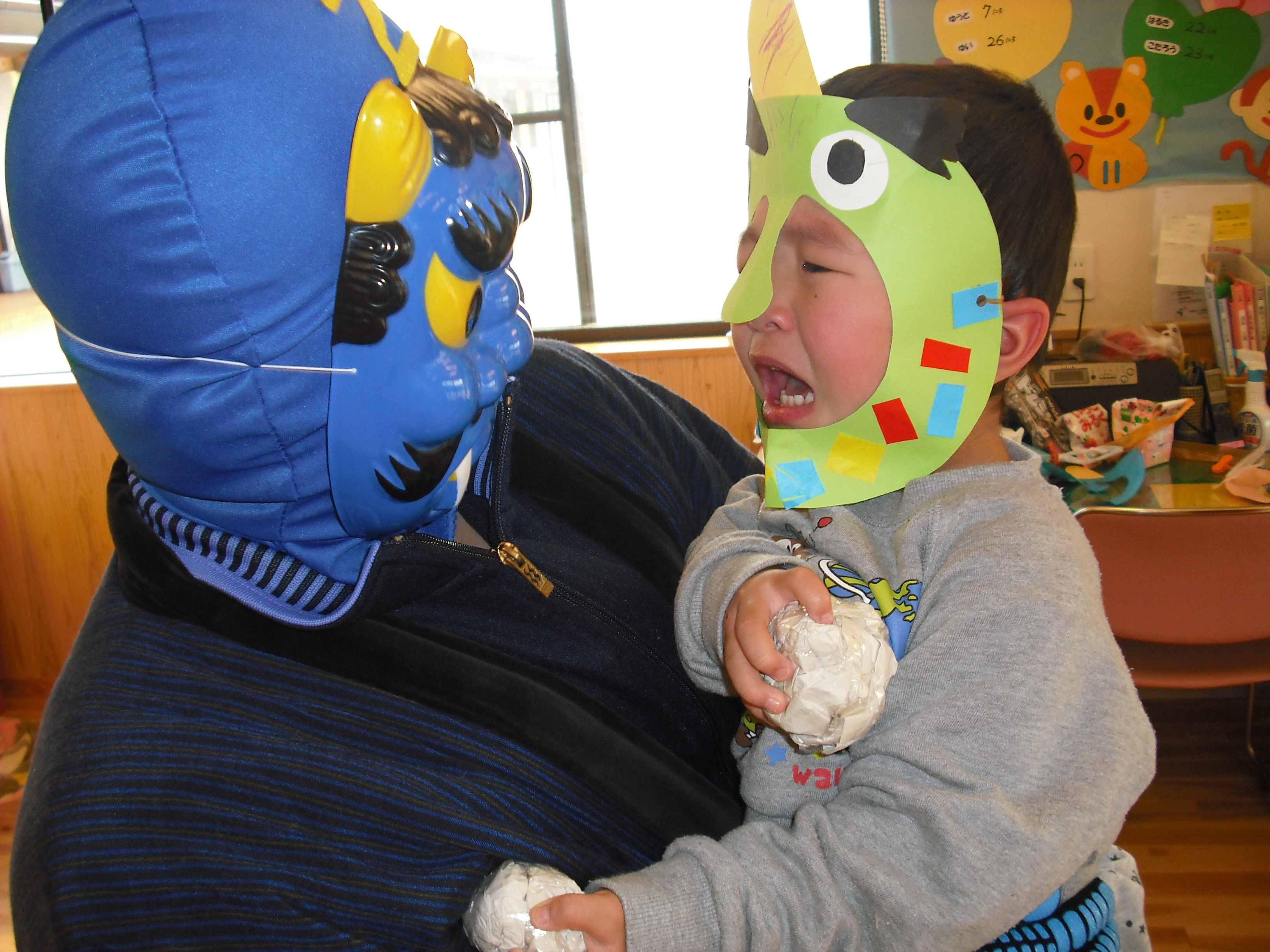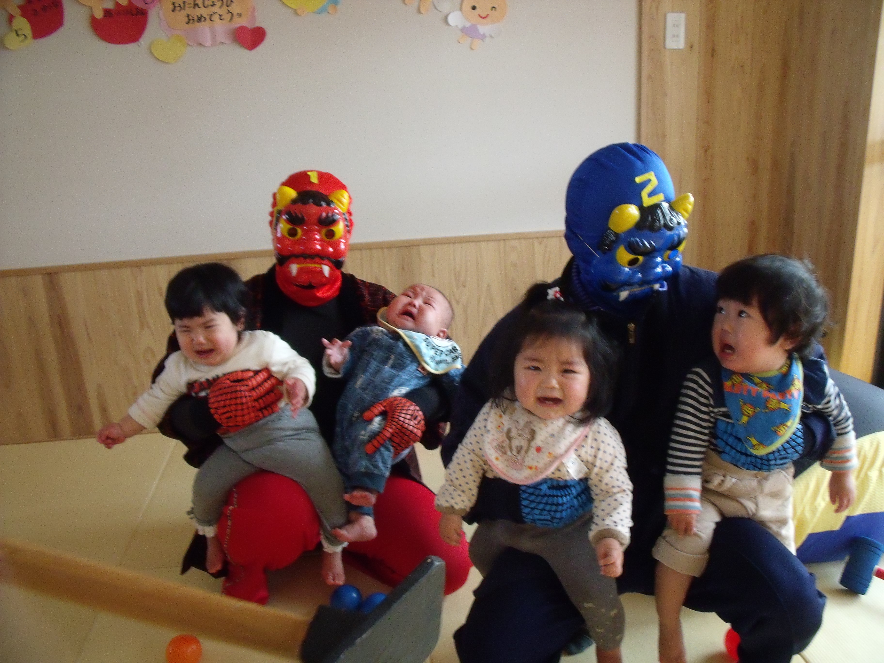 豆まき 2月3日(月) やってきました~☆ 年に1度の絶叫日、子ども達が恐怖に怯える『豆まき』です。 鬼がやってきたら新聞ボールを投げつけて、やっつけてやる! と、威勢のよかった子ども達。 あちらこちらから聞こえてくる泣き叫ぶ声・・・、近づいてくる足音。ボールを持ったまま逃げ惑い、鬼につかまって大泣きです。 でも、なんだか優しい鬼さんですね。抱っこされて記念撮影を行い、また来年ね~♪ と言って帰っていきました。 今夜、夢に出てきて夜泣きするかな?