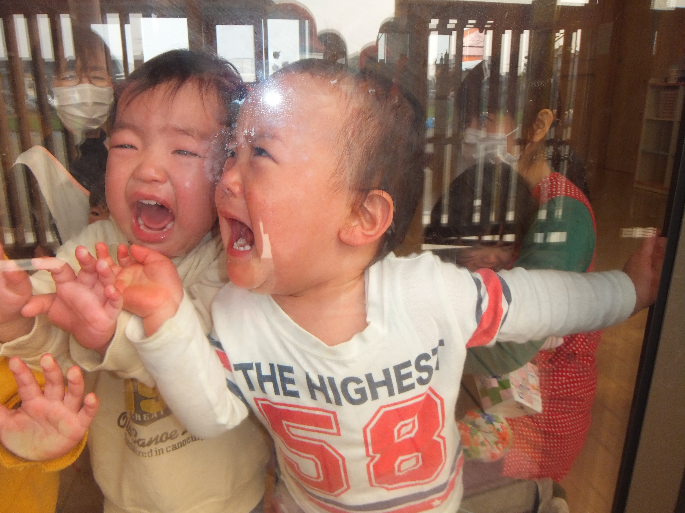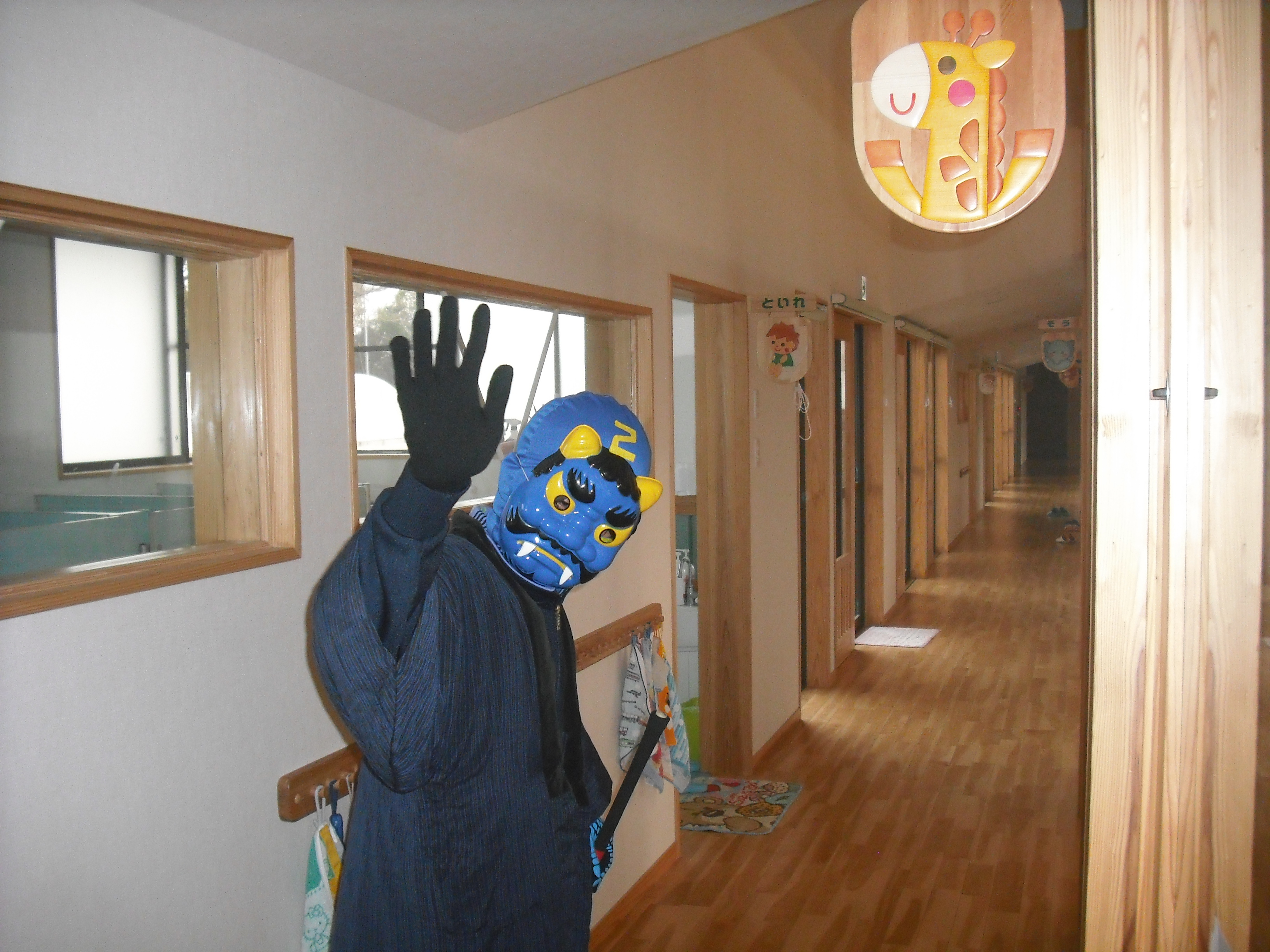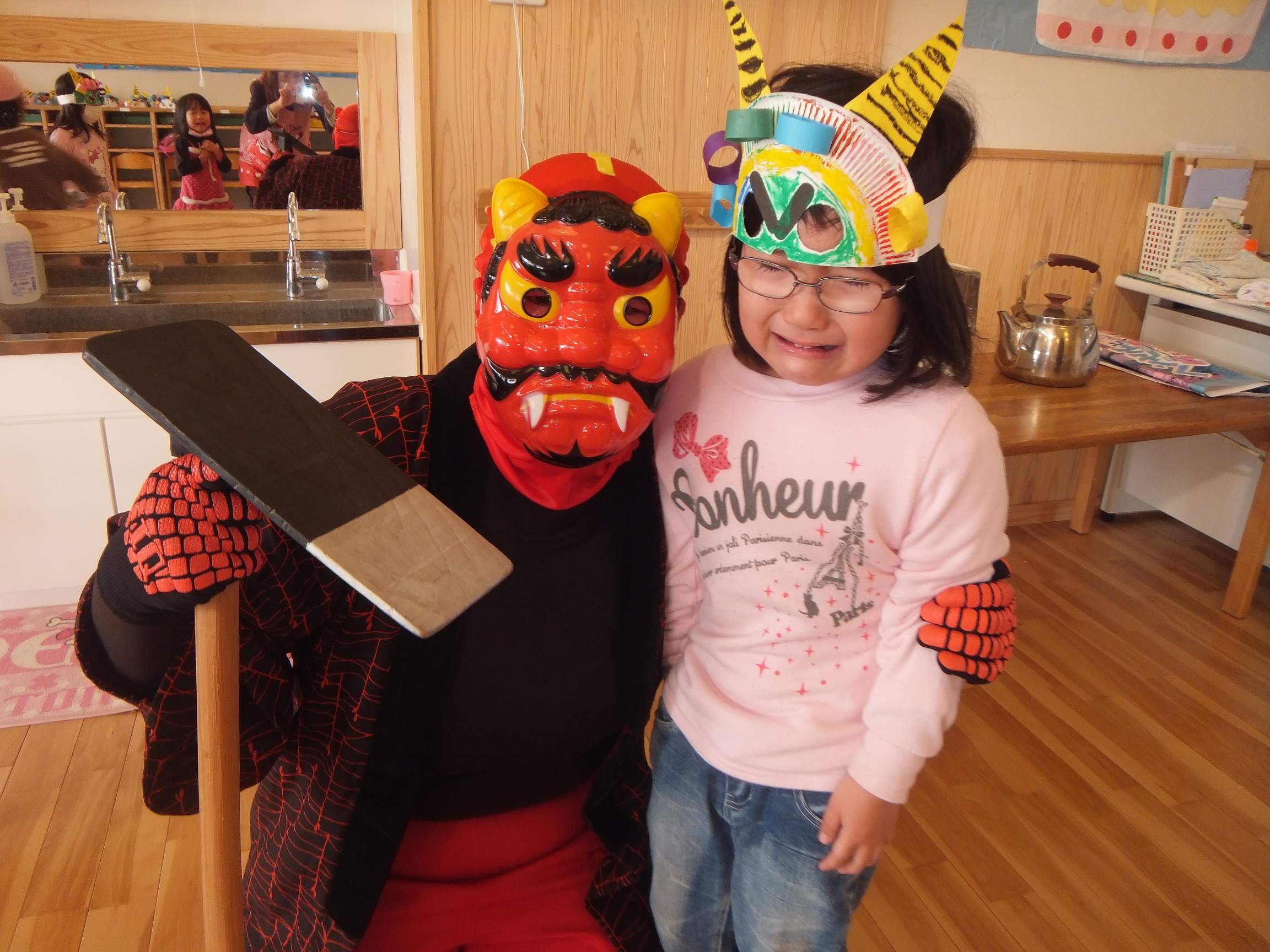 豆まき 2月3日(月) やってきました~☆ 年に1度の絶叫日、子ども達が恐怖に怯える『豆まき』です。 鬼がやってきたら新聞ボールを投げつけて、やっつけてやる! と、威勢のよかった子ども達。 あちらこちらから聞こえてくる泣き叫ぶ声・・・、近づいてくる足音。ボールを持ったまま逃げ惑い、鬼につかまって大泣きです。 でも、なんだか優しい鬼さんですね。抱っこされて記念撮影を行い、また来年ね~♪ と言って帰っていきました。 今夜、夢に出てきて夜泣きするかな?