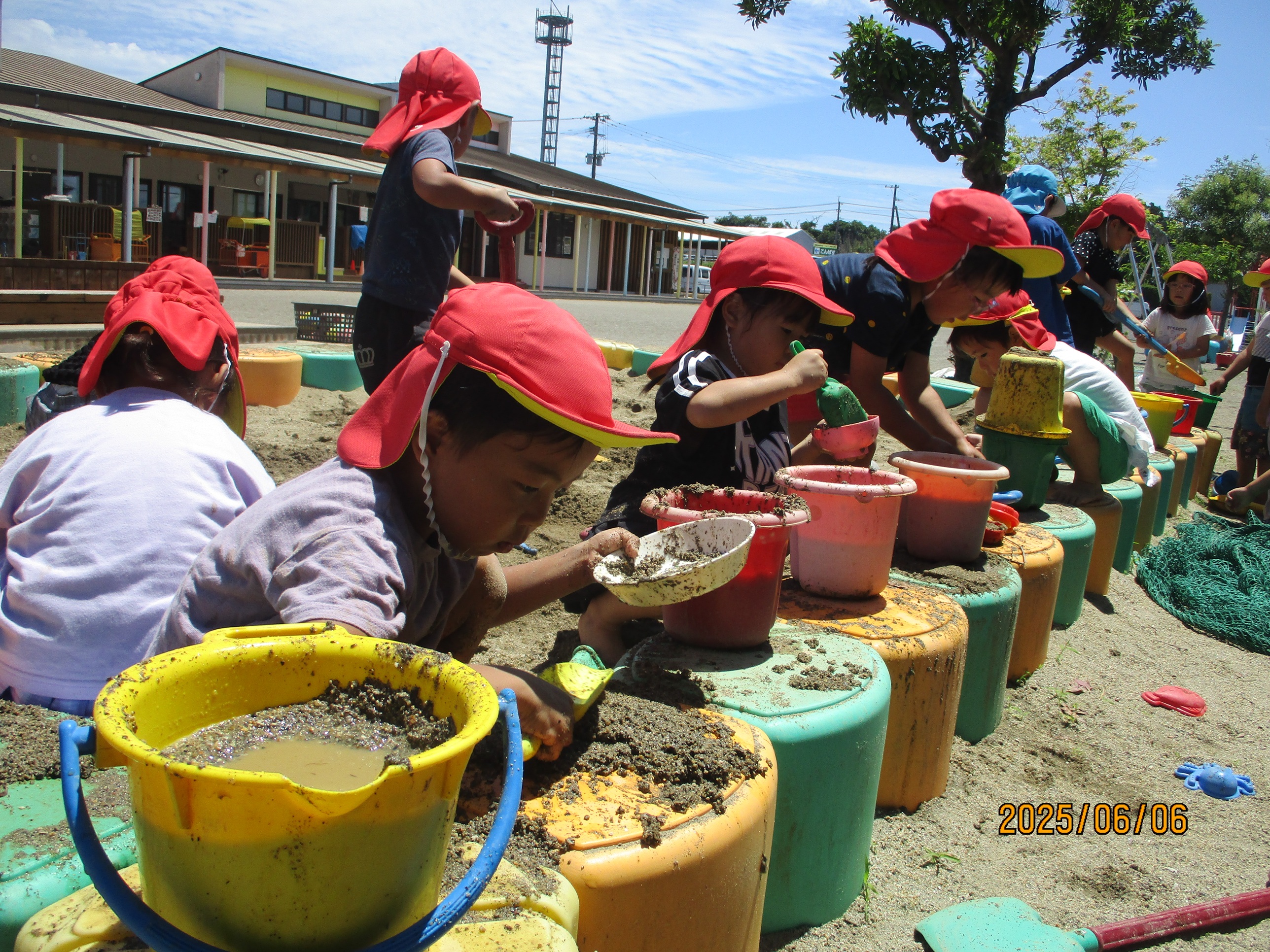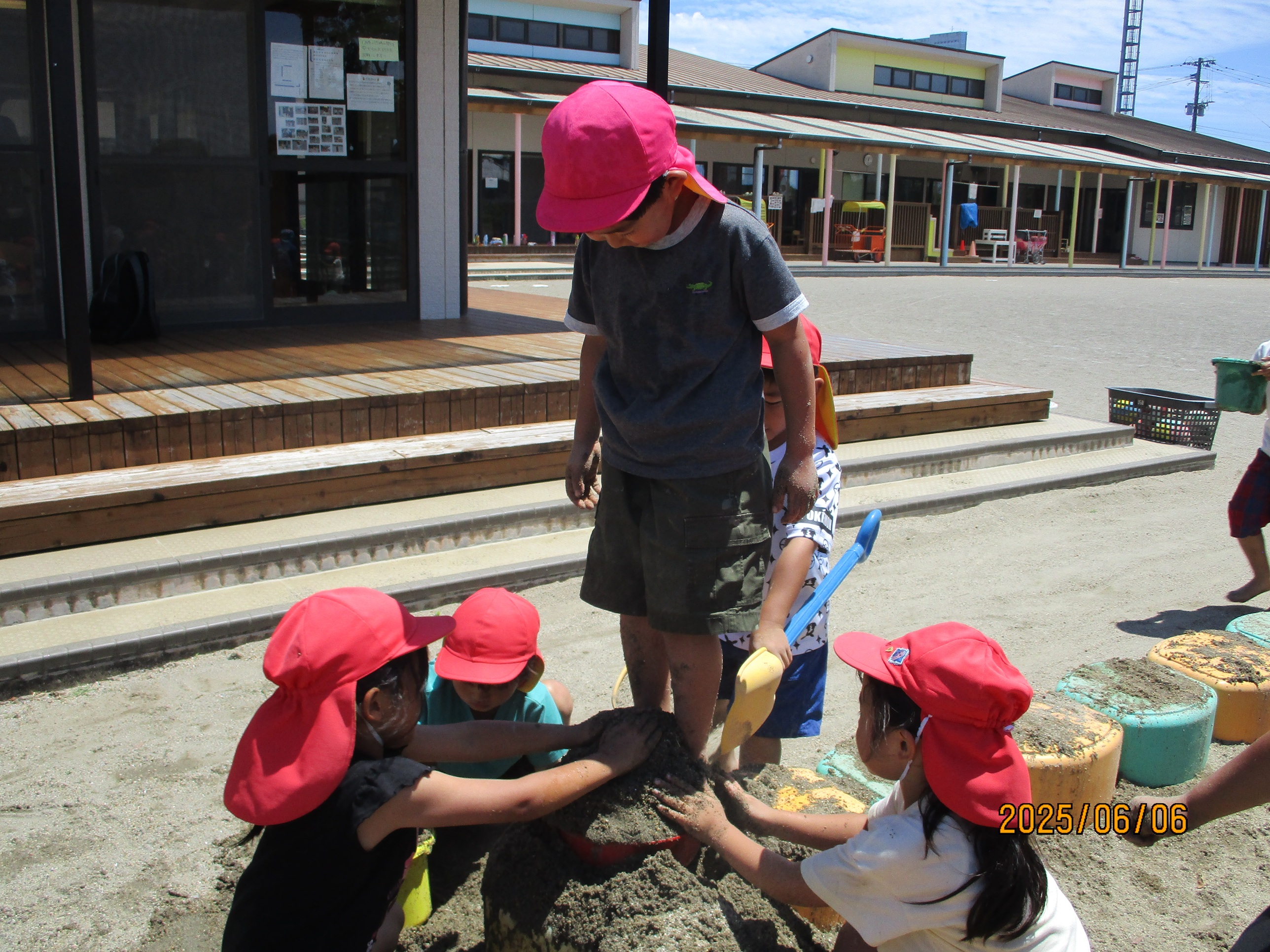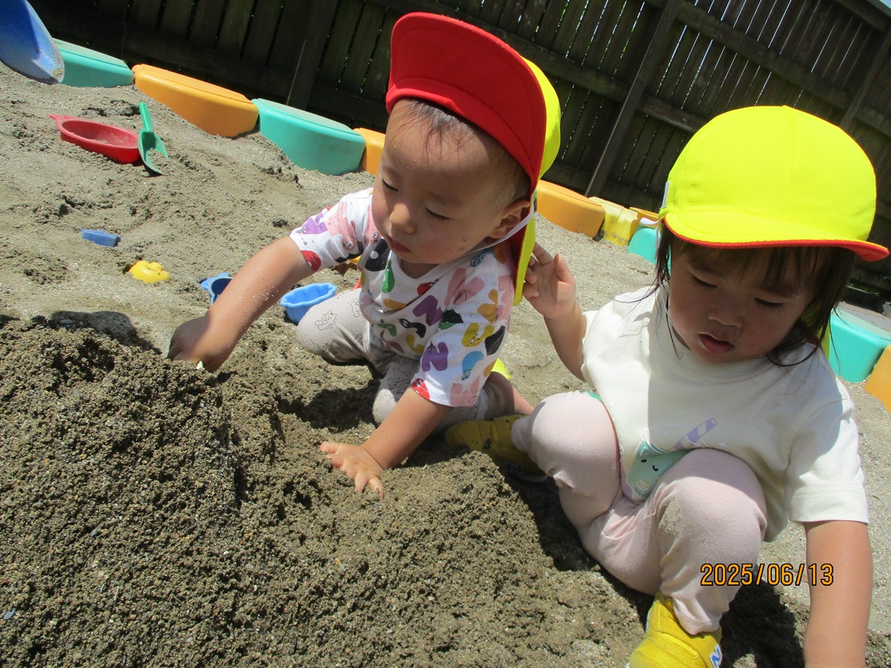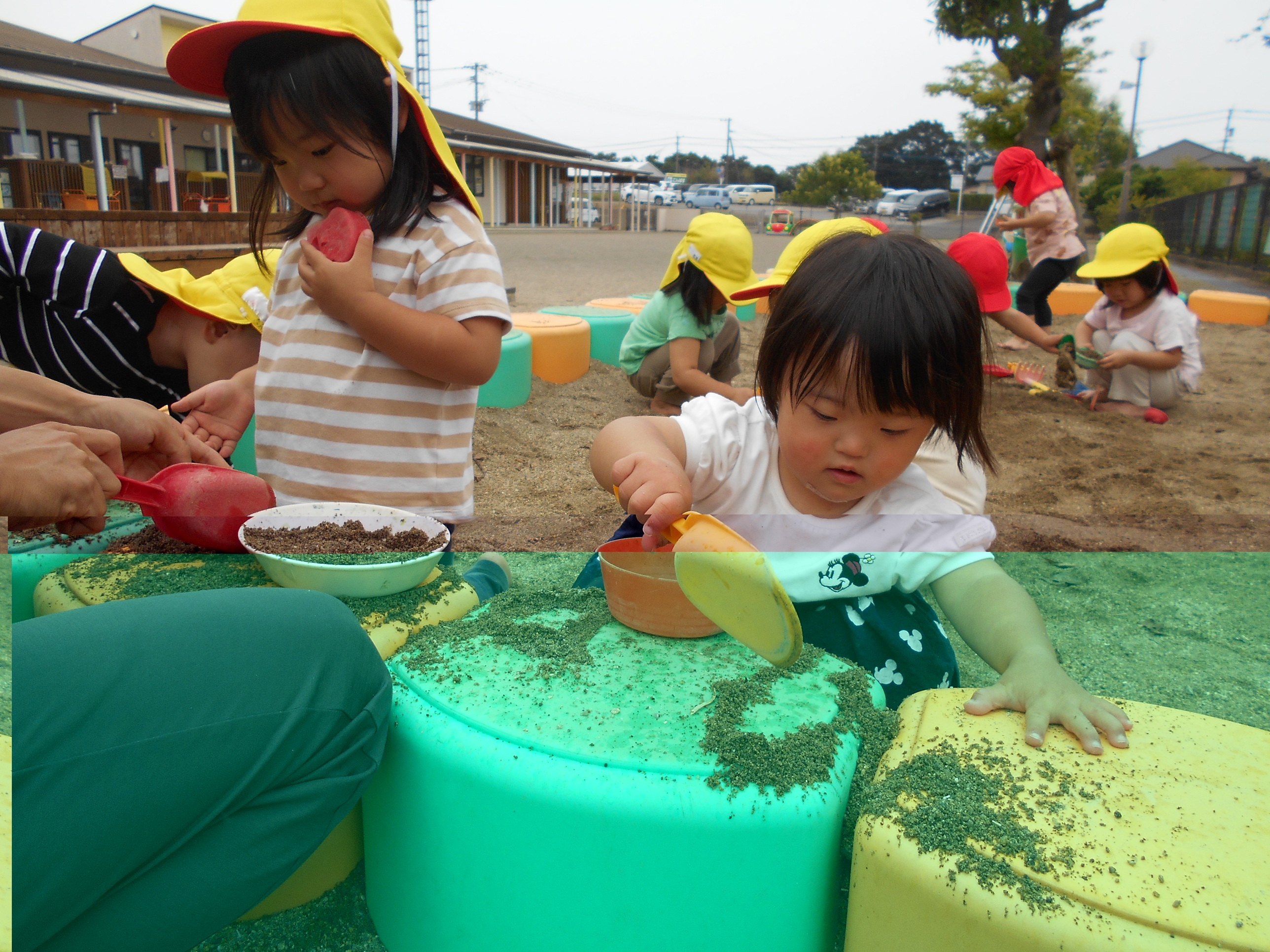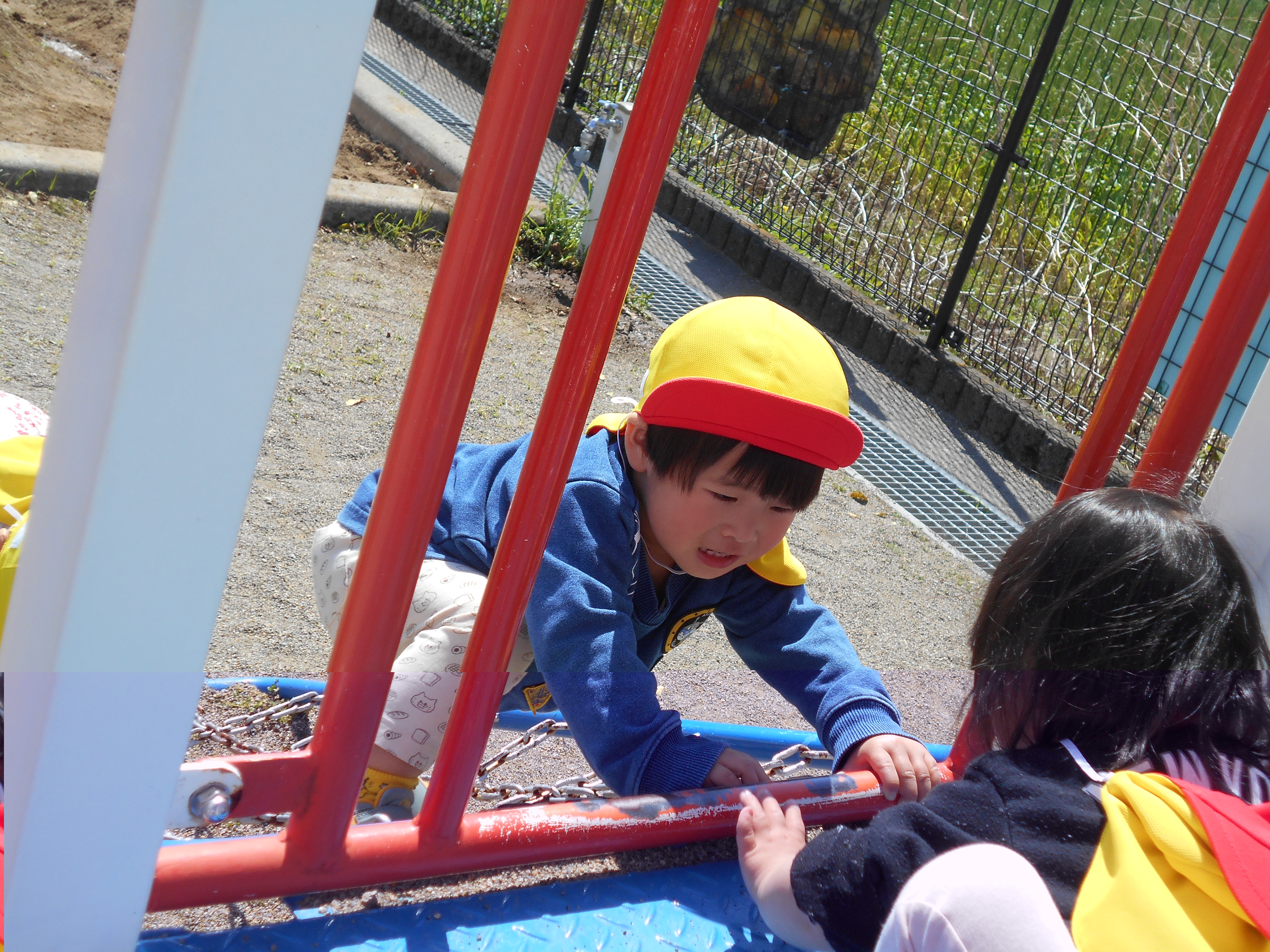 天気が良い日は園庭に出てすきな遊びを楽しんでいる子どもたち。遊具に乗ったり、砂場では泥んこ遊びが始まったり・・・お友だちと会話を楽しみながら楽しく過ごしています。