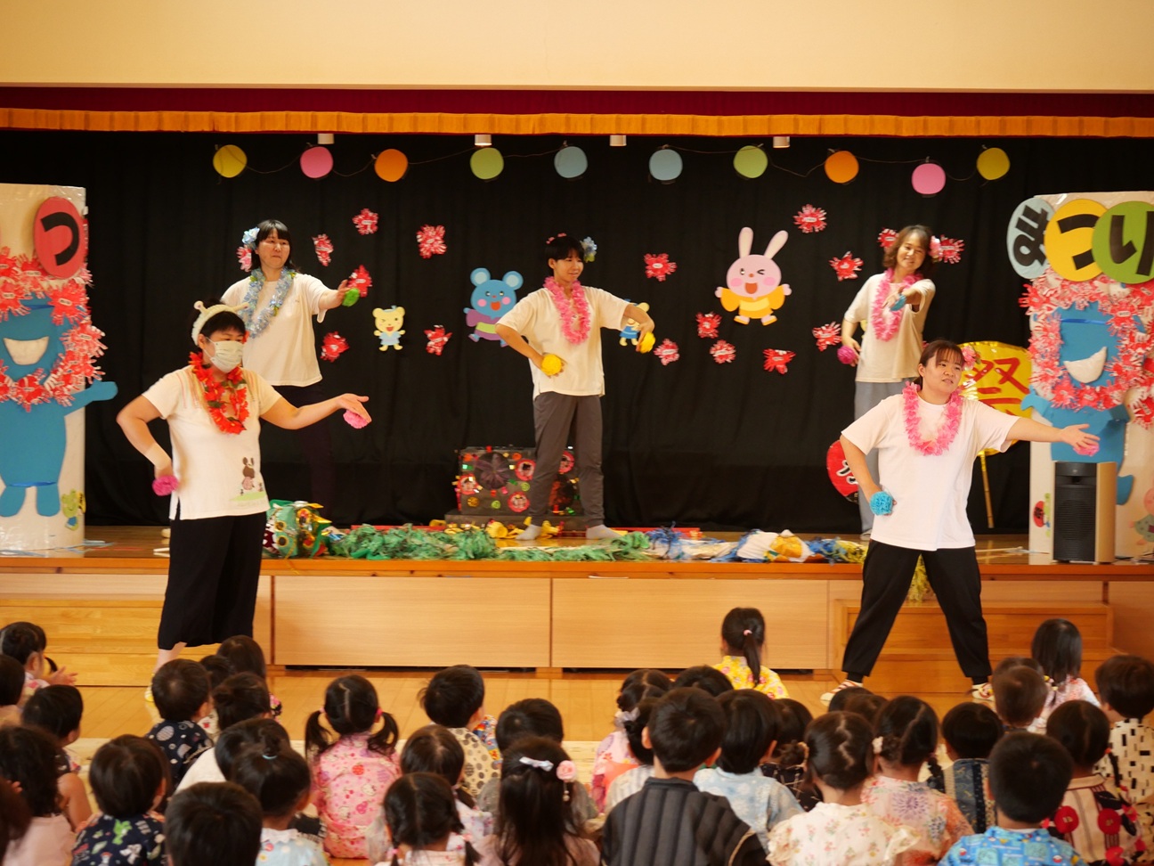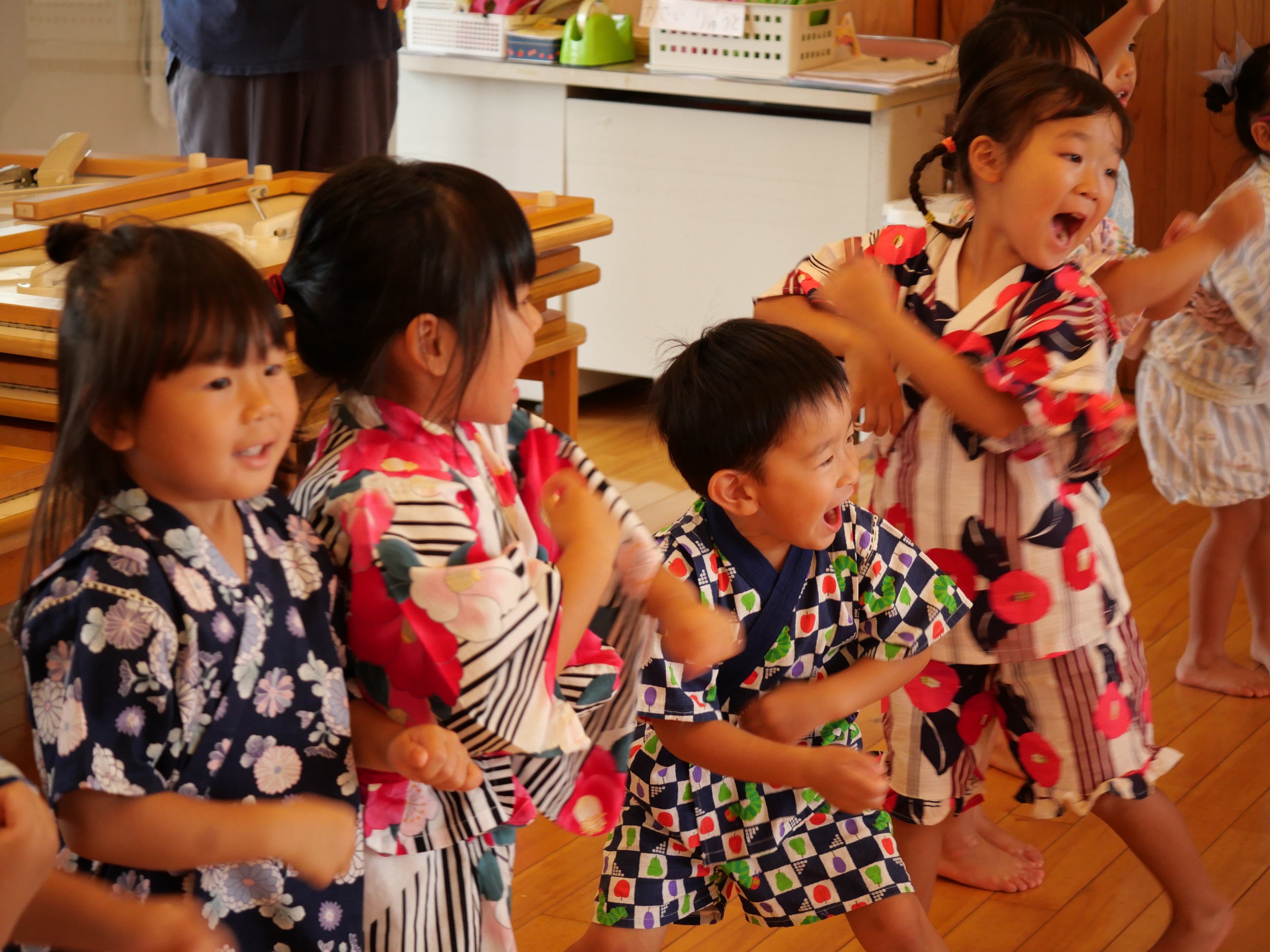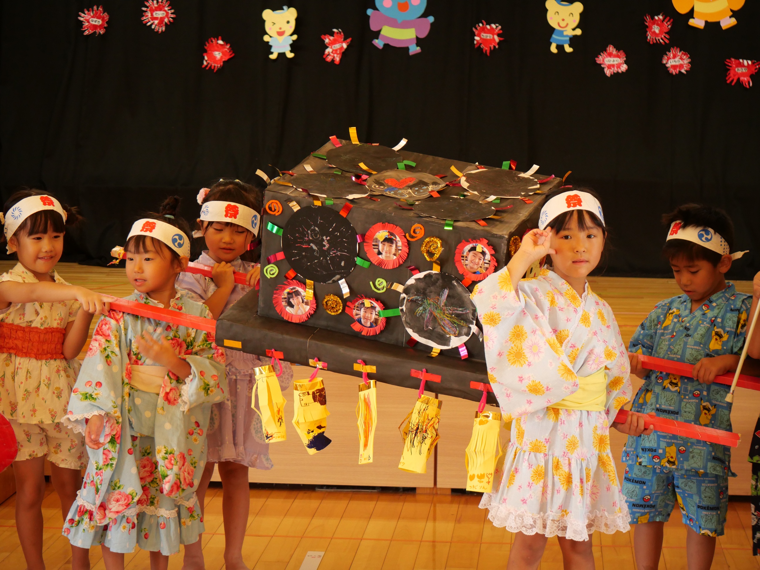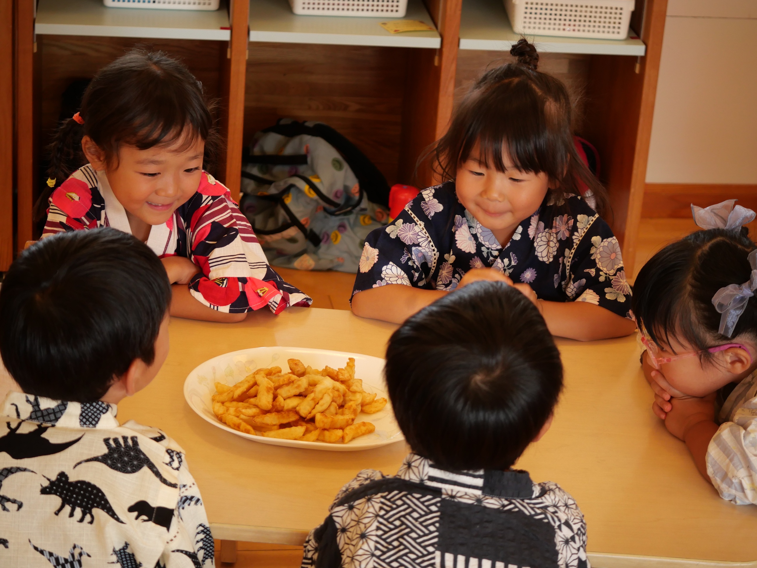 おまつりごっこ!! 7月4日(金) 「ワッショイ!ワッショイ!!」年長さんの元気な掛け声が園内に響き渡りおまつりごっこスタート!!この日はみんな浴衣や甚平を着てワクワク♪先生たちによるマジックショーやフラダンスショーを見たり輪投げや魚釣りゲームなども楽しみました。お昼ご飯もポテトやカレーにニコニコ。山盛りポテトに釘付けです。