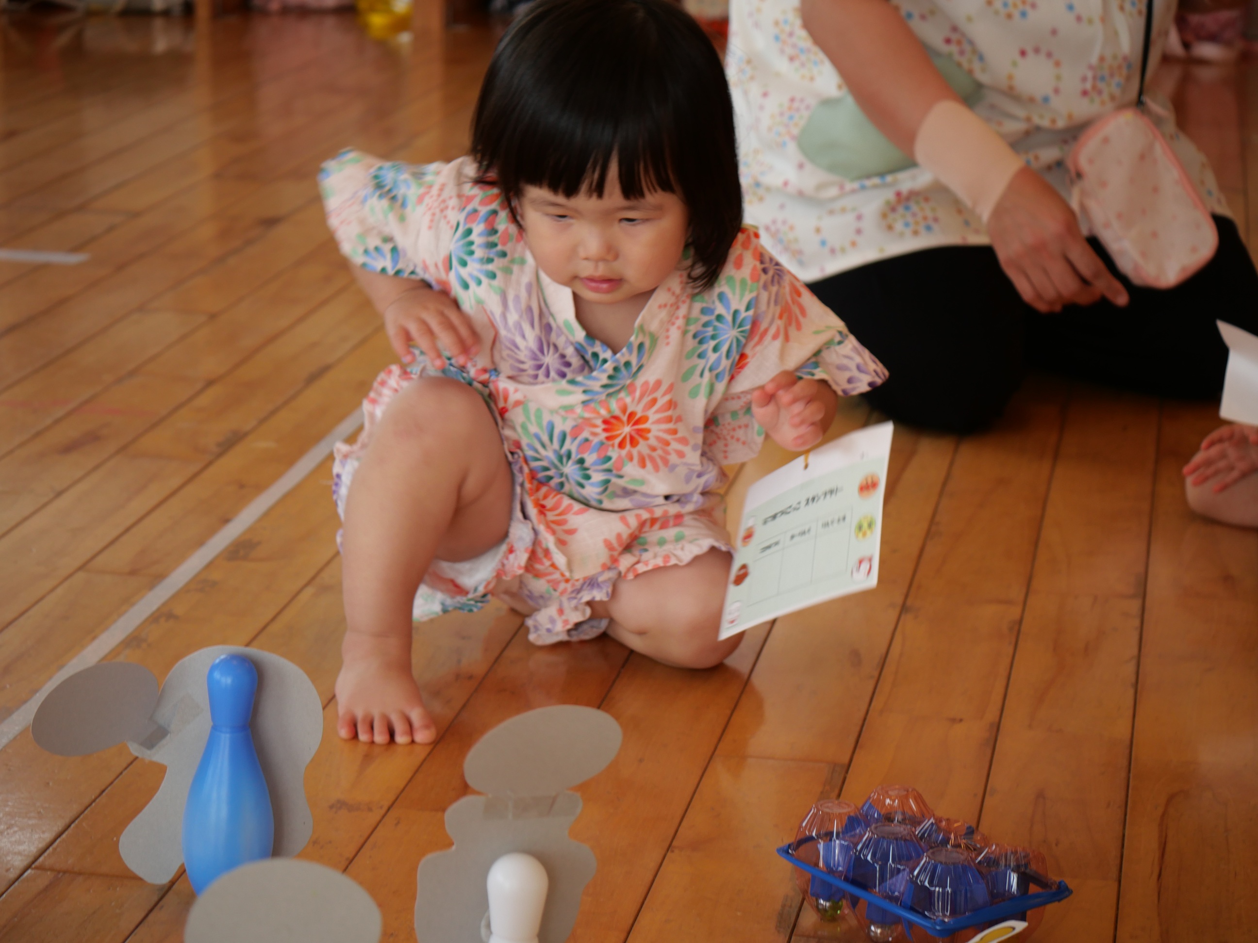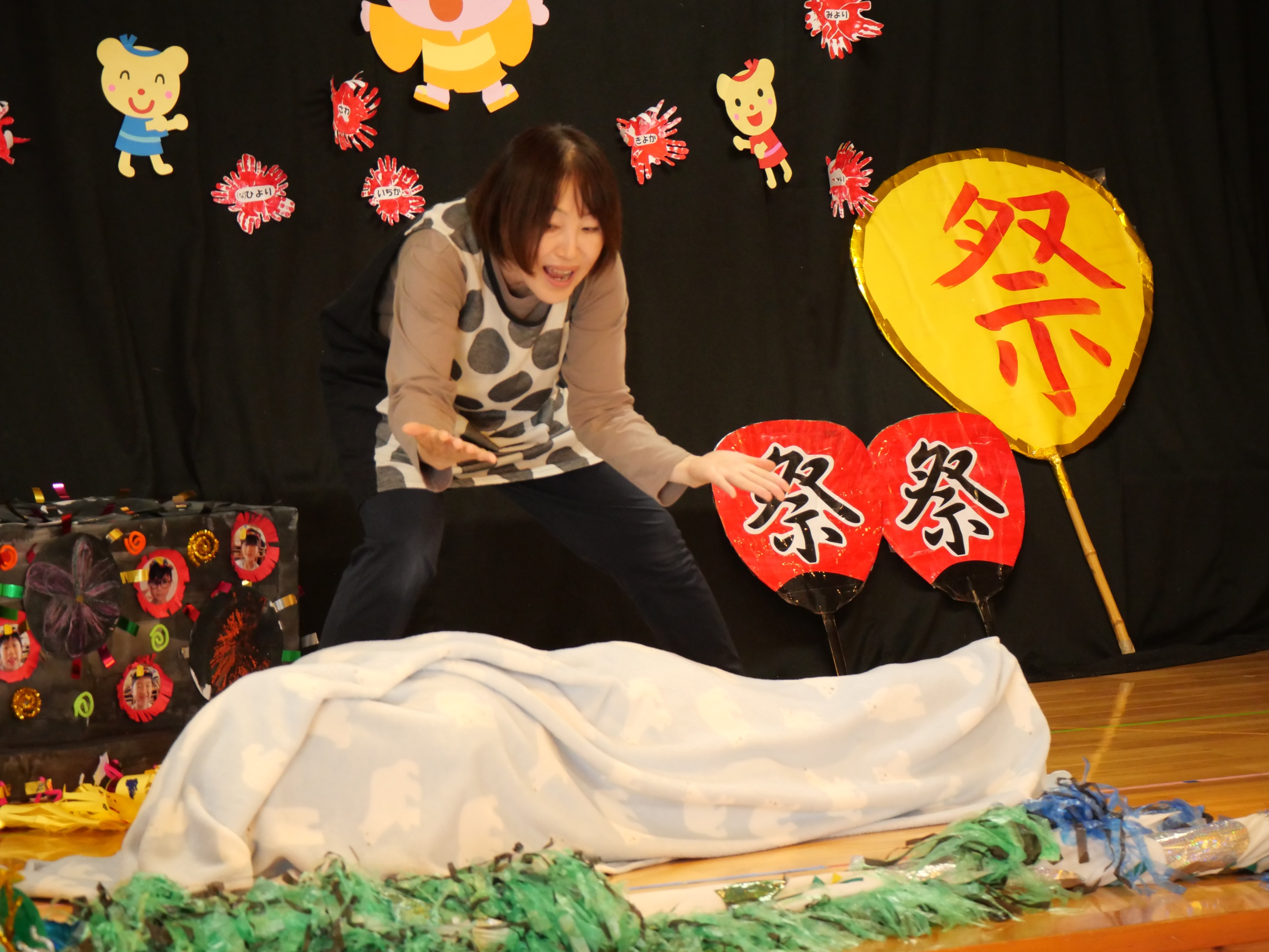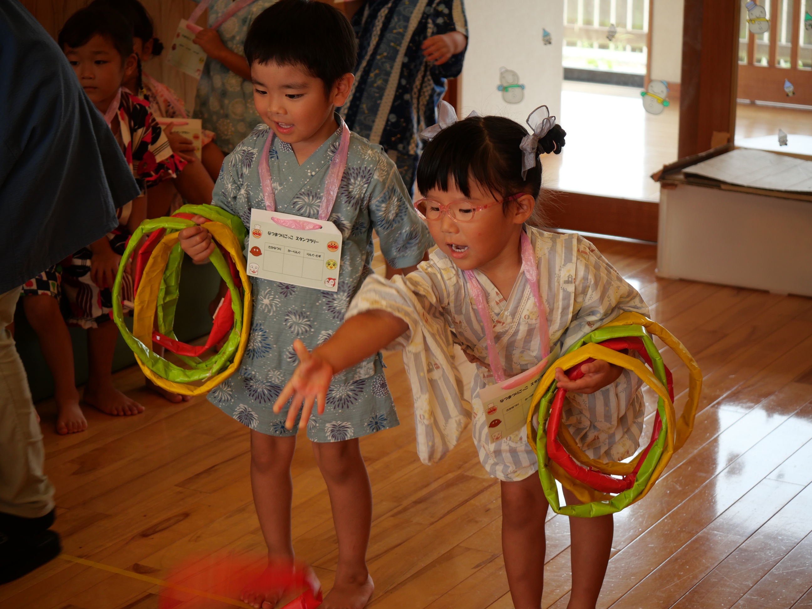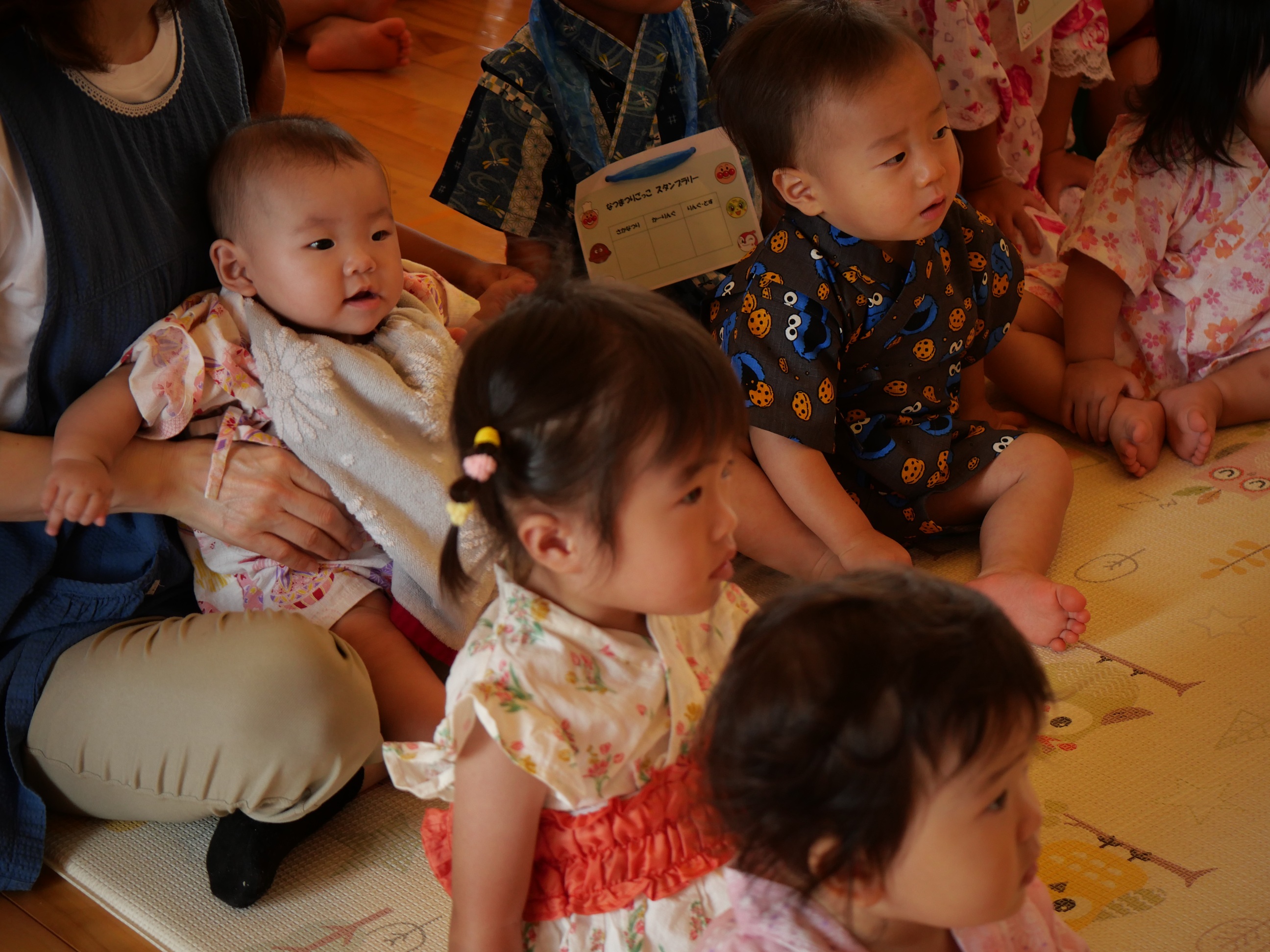 おまつりごっこ!! 7月4日(金) 「ワッショイ!ワッショイ!!」年長さんの元気な掛け声が園内に響き渡りおまつりごっこスタート!!この日はみんな浴衣や甚平を着てワクワク♪先生たちによるマジックショーやフラダンスショーを見たり輪投げや魚釣りゲームなども楽しみました。お昼ご飯もポテトやカレーにニコニコ。山盛りポテトに釘付けです。