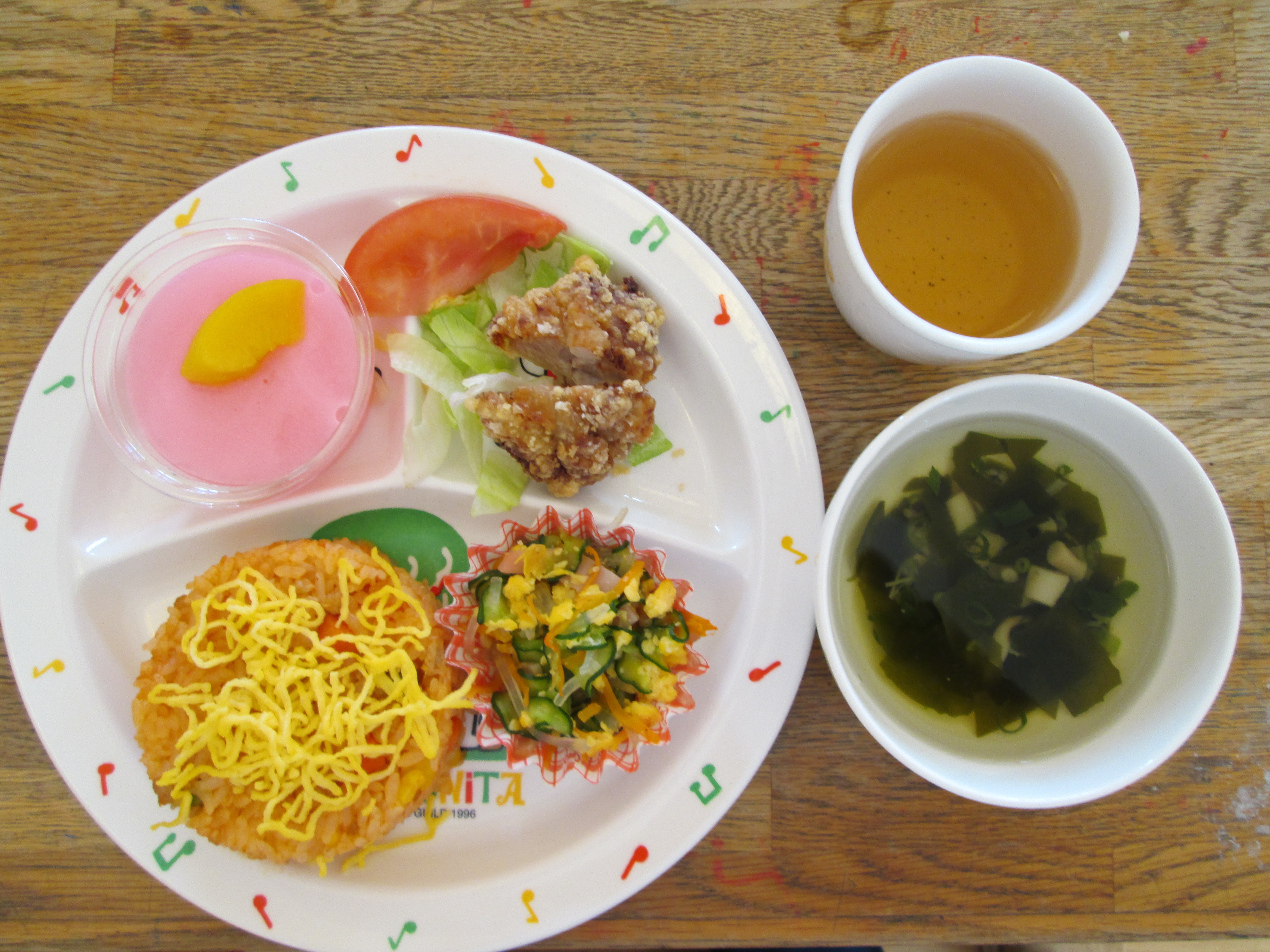 4月誕生会 4月16日(水) 4月の誕生会を行いました。 今月の誕生会メニューは、チキンライス・から揚げ・酢の物・ワカメスープ・春の香りのゼリーでした。子ども達の大好物だったので、おかわりする子ども達が沢山いましたよ。