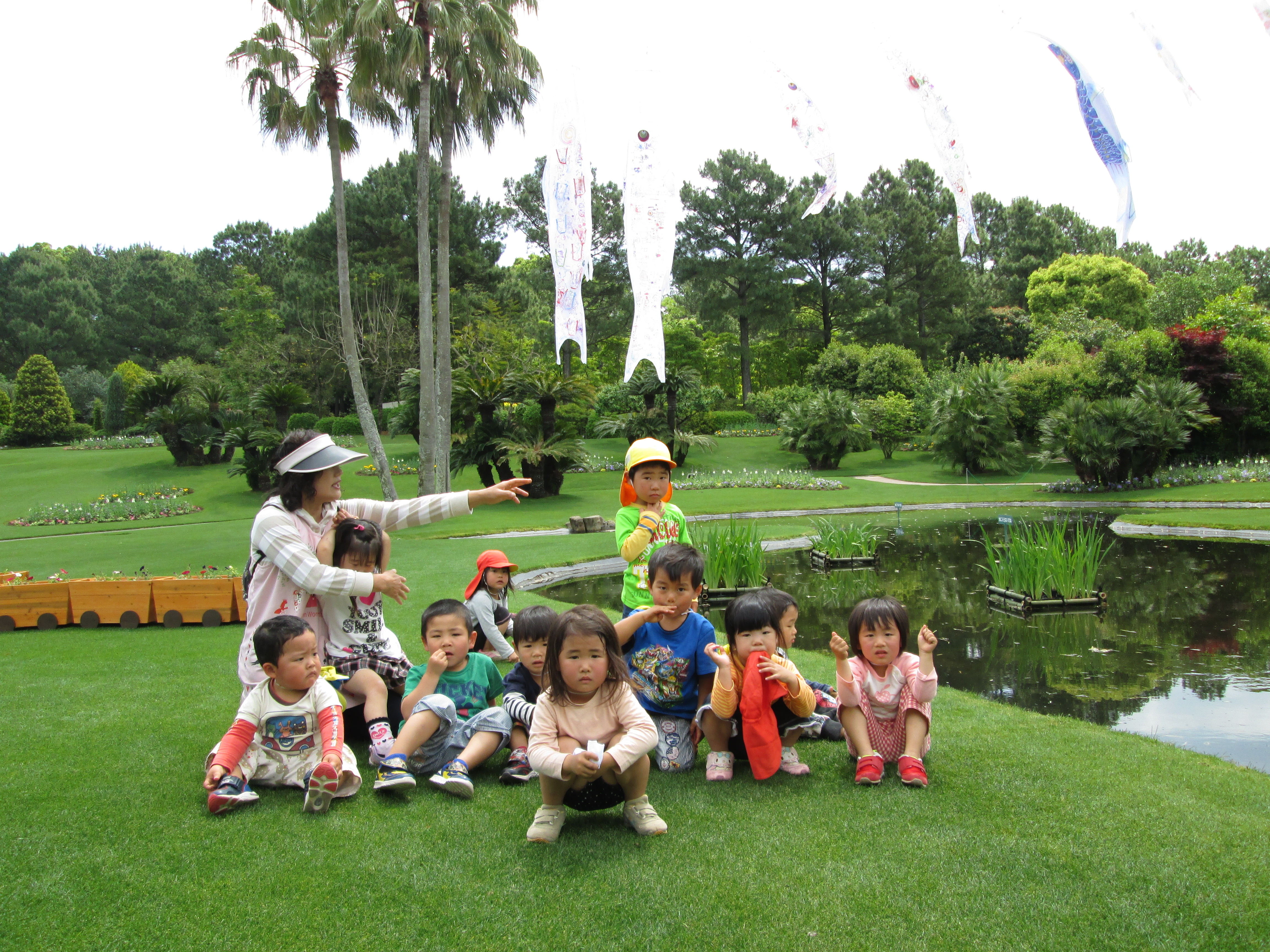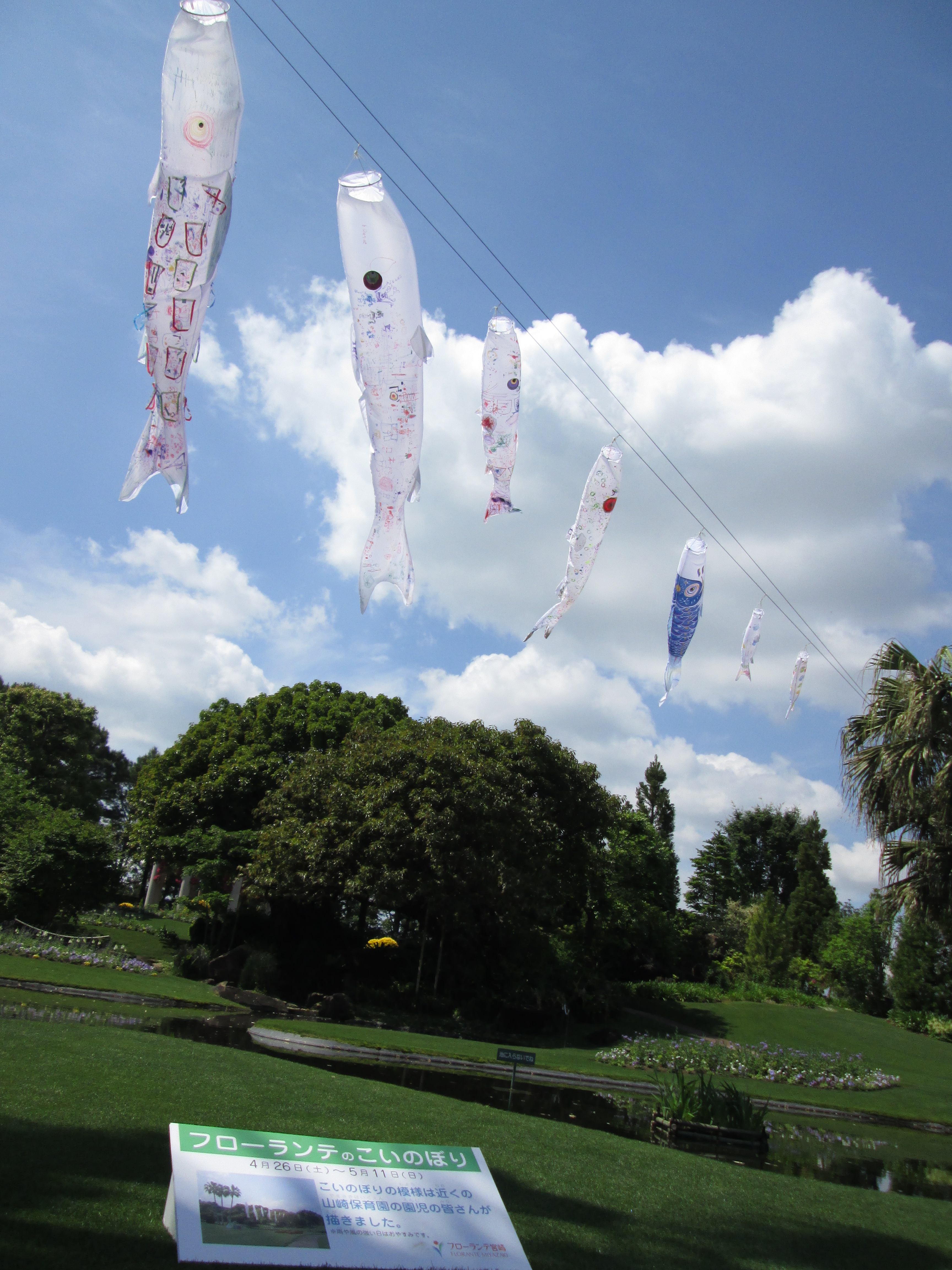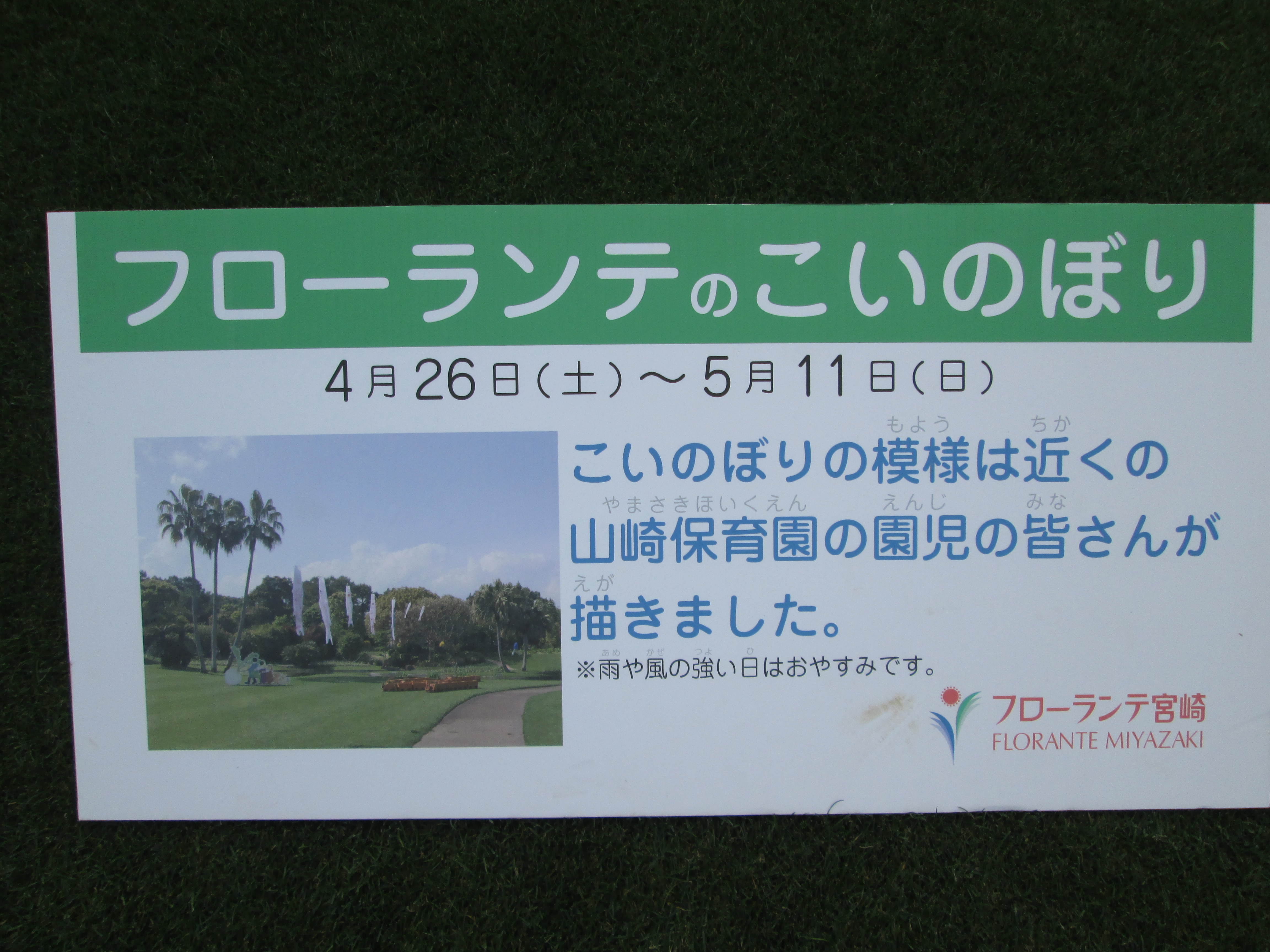 フローランテのこいのぼり 5月1日(木) 4月26日~5月11日まで、フローランテ宮崎に子ども達が作った鯉のぼりが泳いでいます。 各クラスごとに、クレヨン・ペン・スタンプなど色々な画材を使って世界に一つしかない鯉のぼりを作りました。 みんなの力作が、ピクニックガーデンで元気一杯泳いでいますよ~。