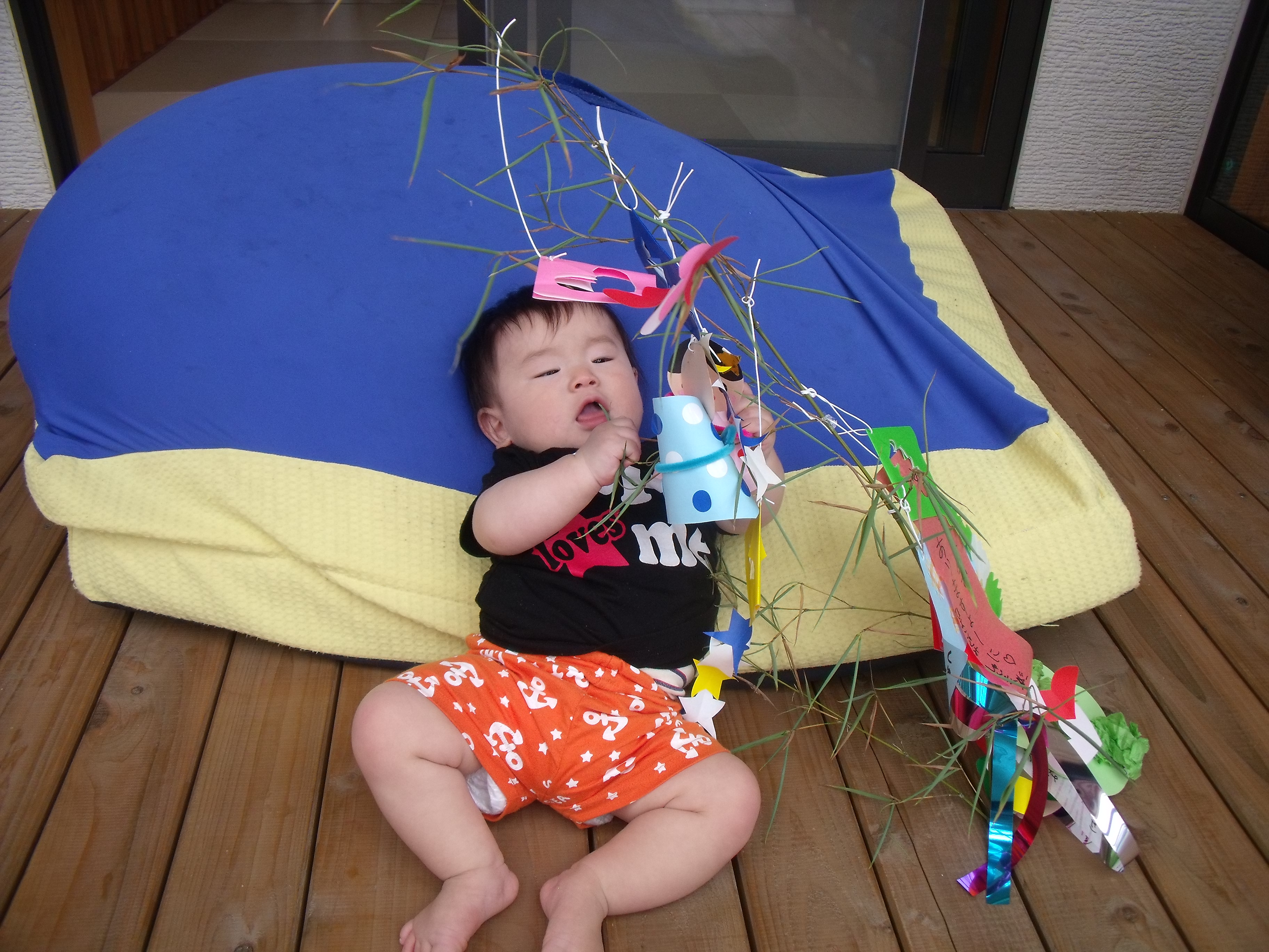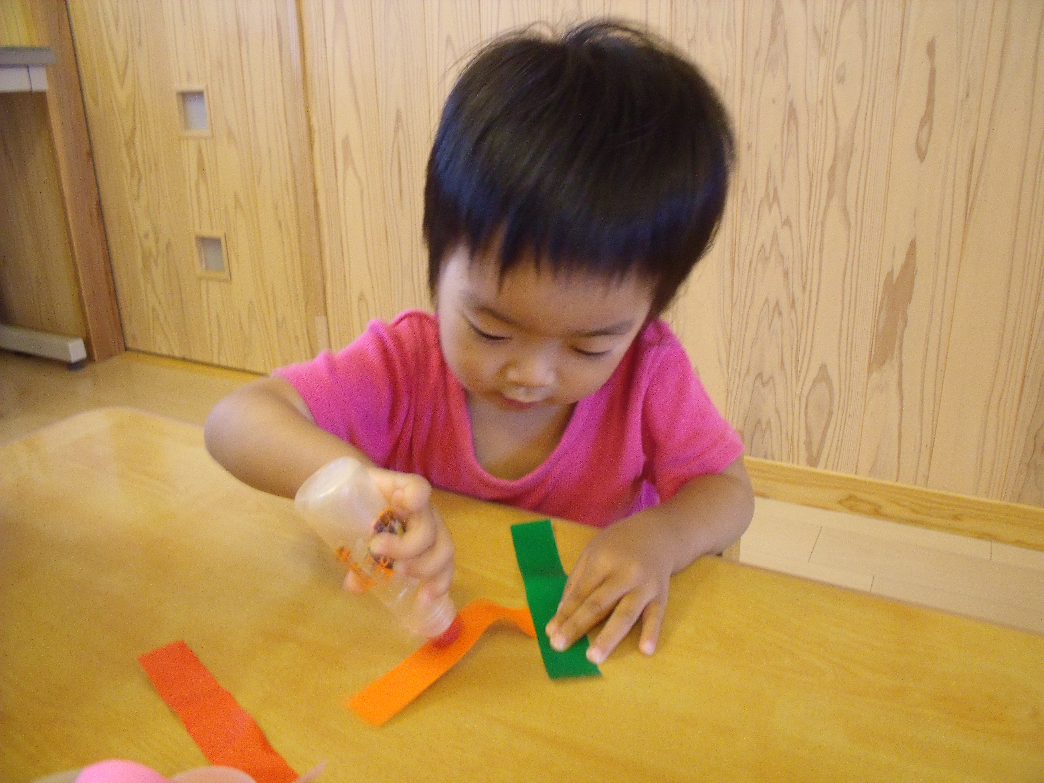 七夕飾り 6月29日(月) ひよこ組さんも先生と一緒に七夕飾りを作りましたよ。 身長と同じ位の笹飾りができました~。 心も体も大きく成長しますように・・・。来年の七夕は、笹飾りより大きくなっていることでしょう。