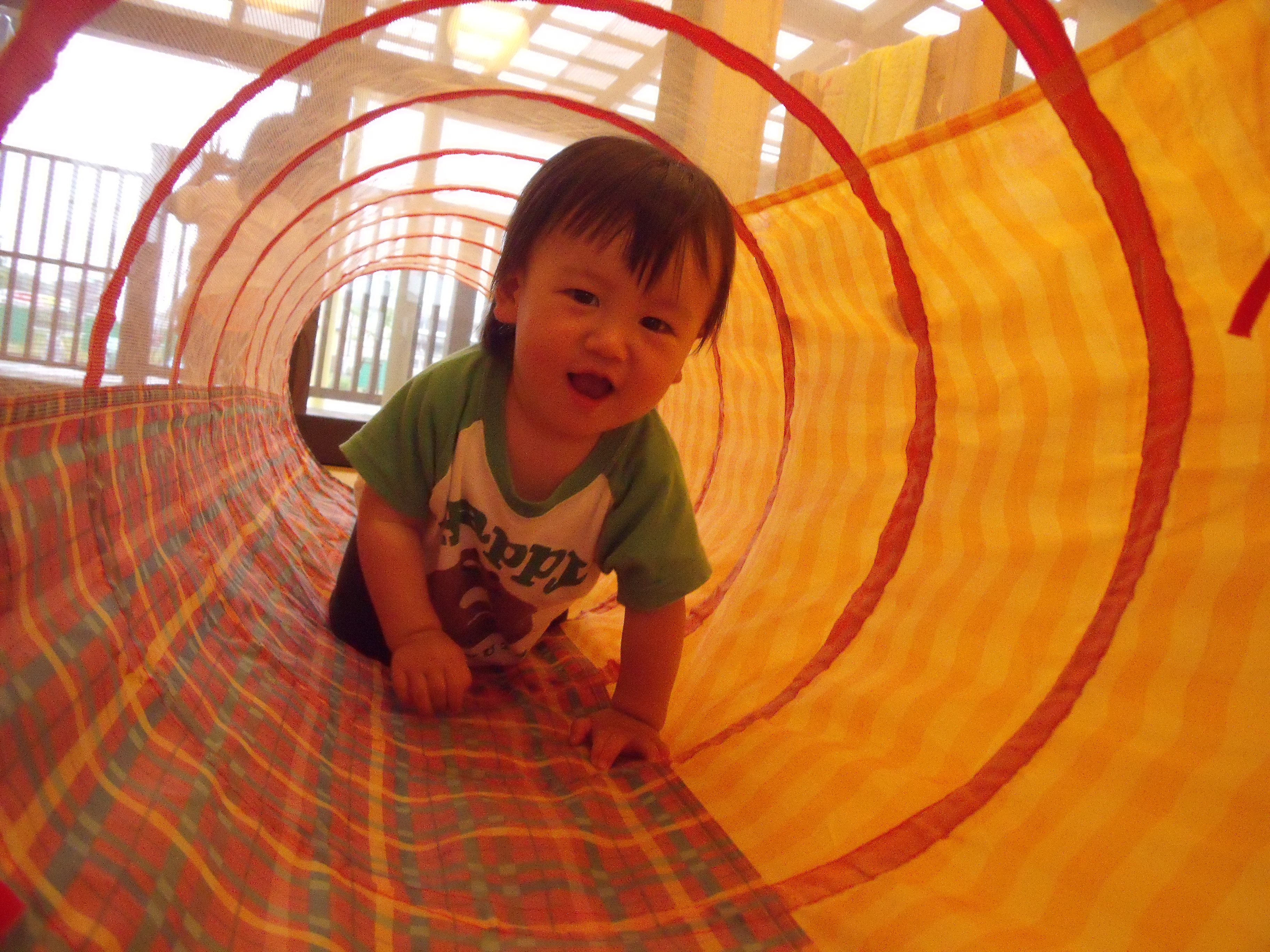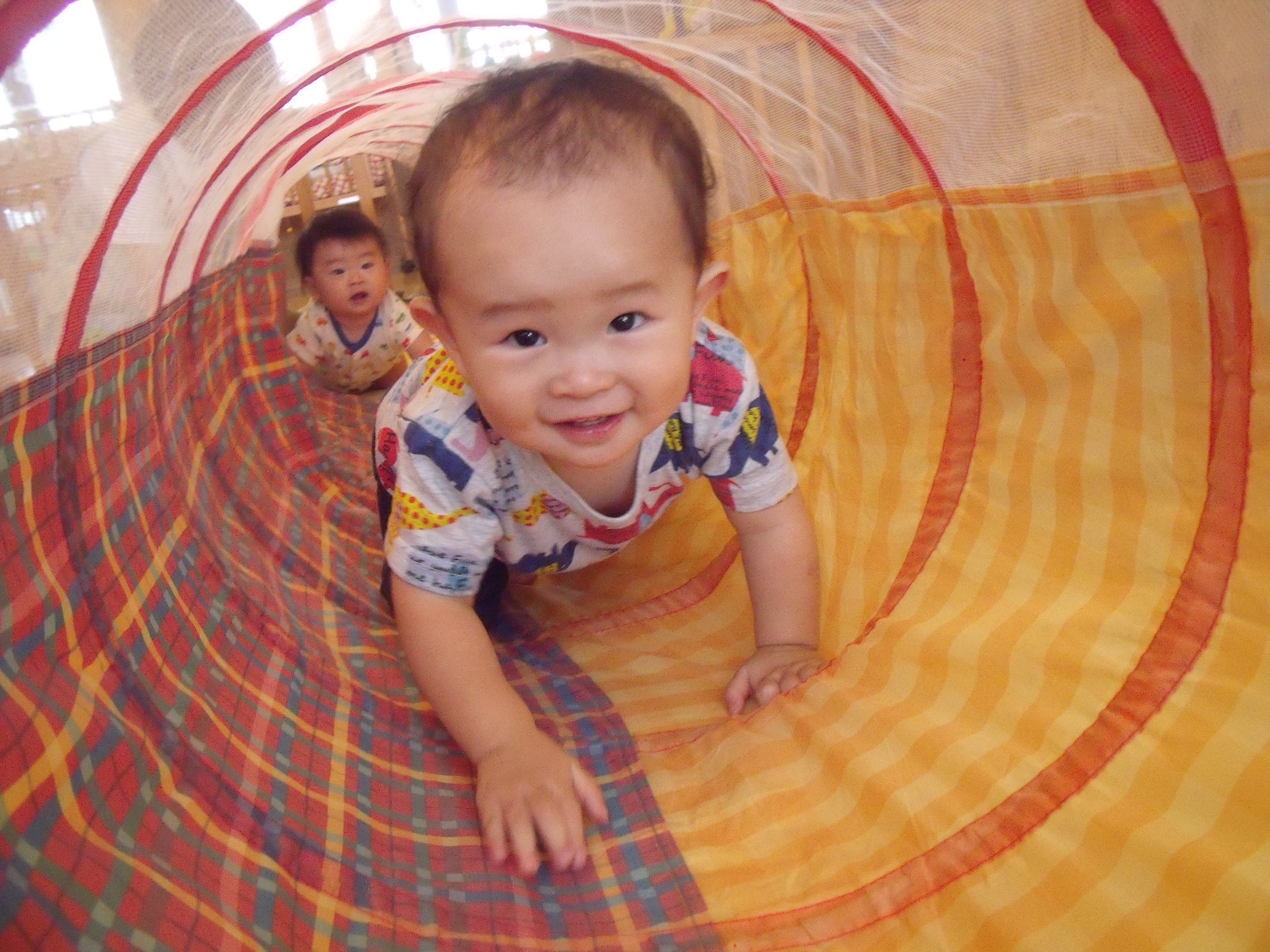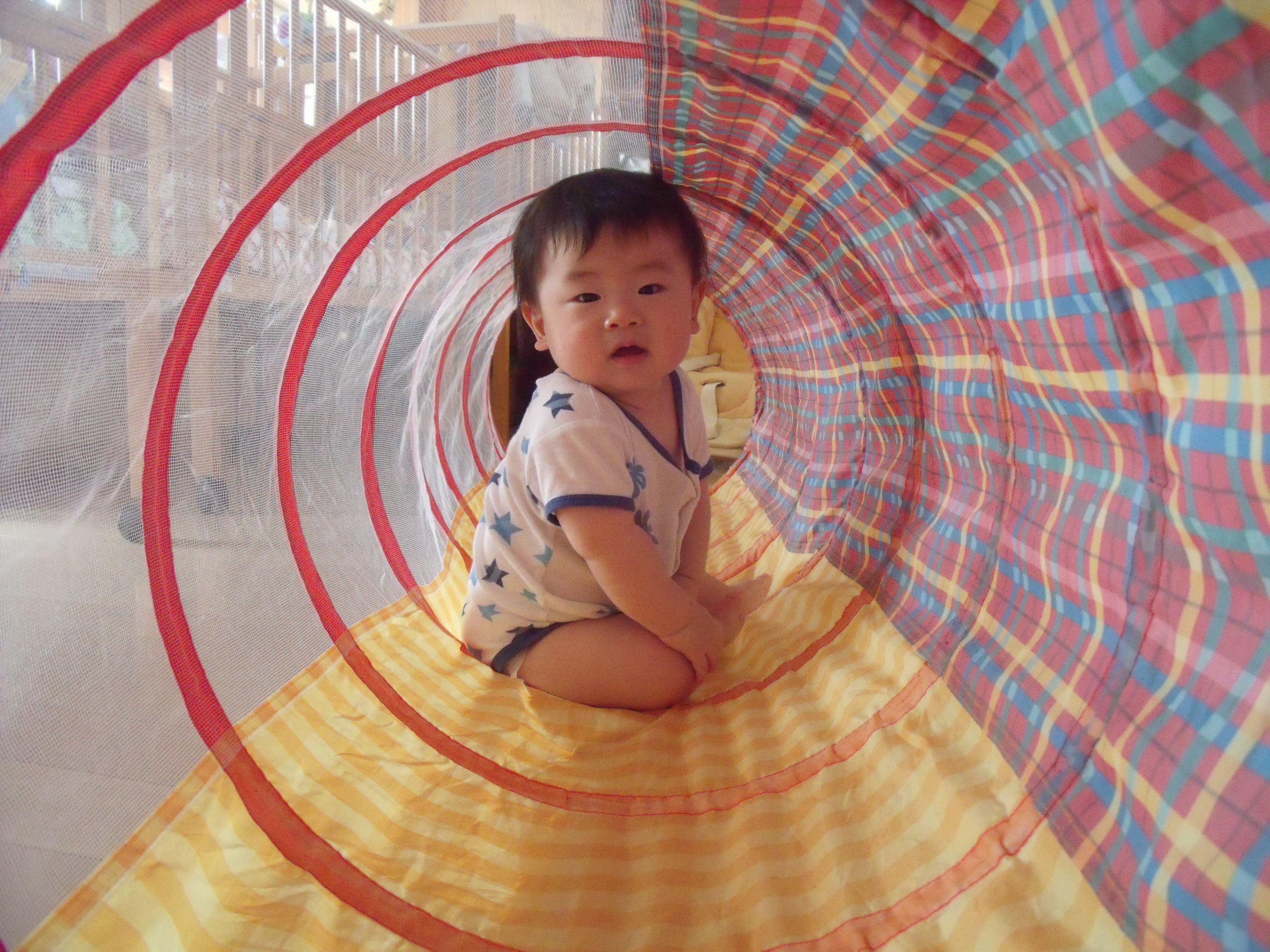 トンネルあそび 7月22日(水) ひよこ組さんが、トンネルあそびを行っています。 最初は少し怖かったけど、慣れたらニコニコ笑顔で前に進んだりバックしたり、途中で止まったり・・・。 何度も繰り返しくぐって楽しく遊びました。