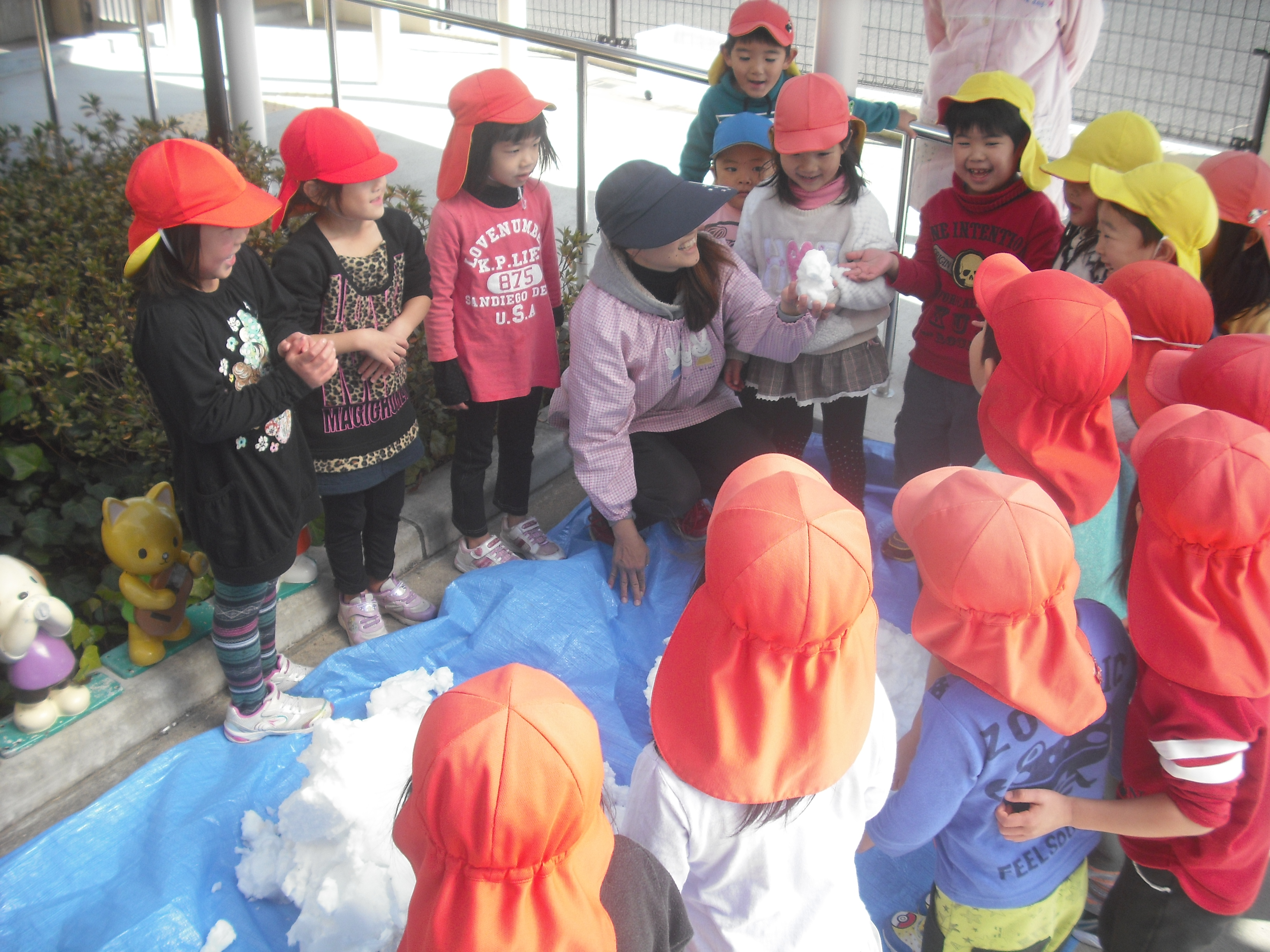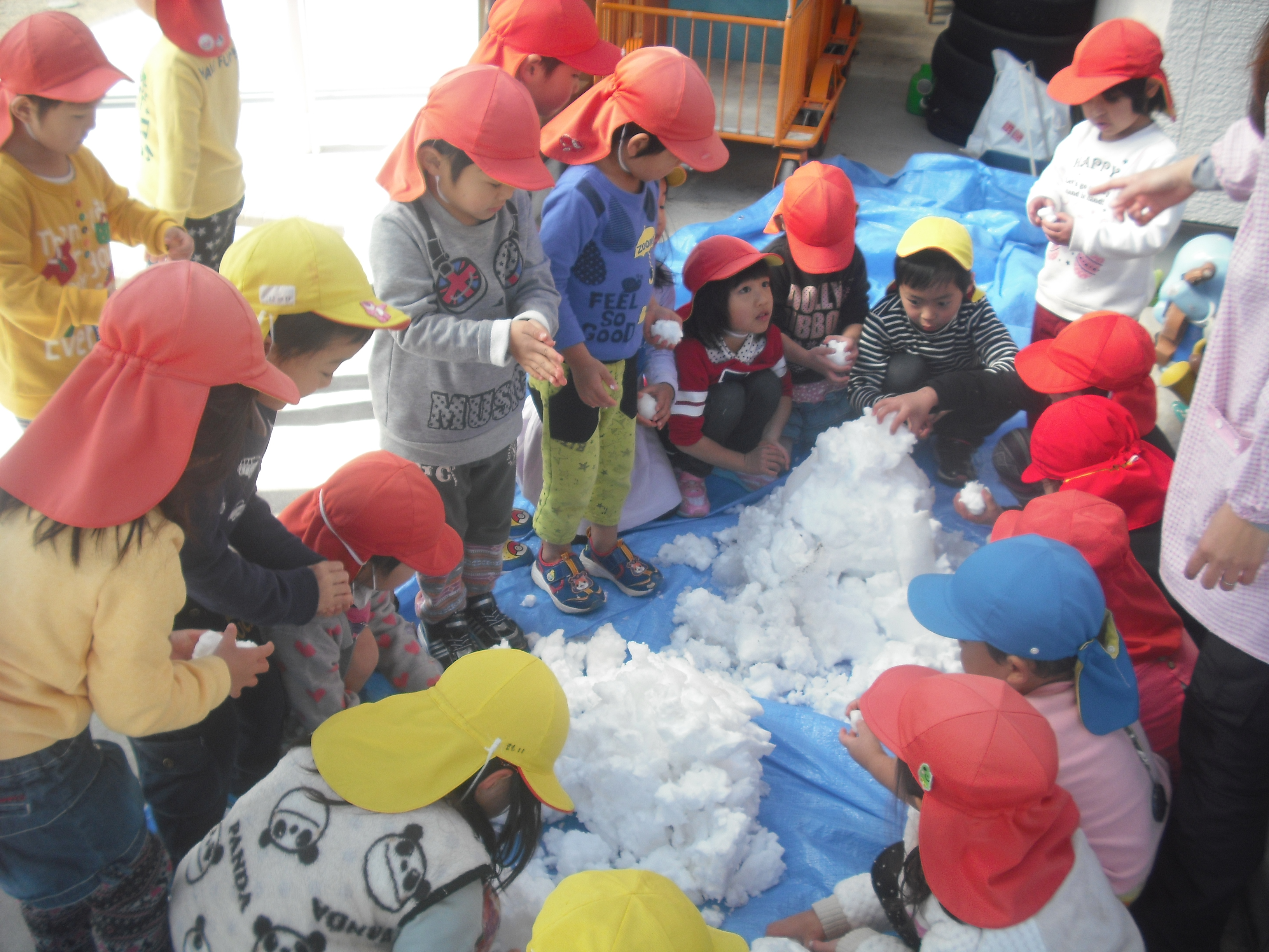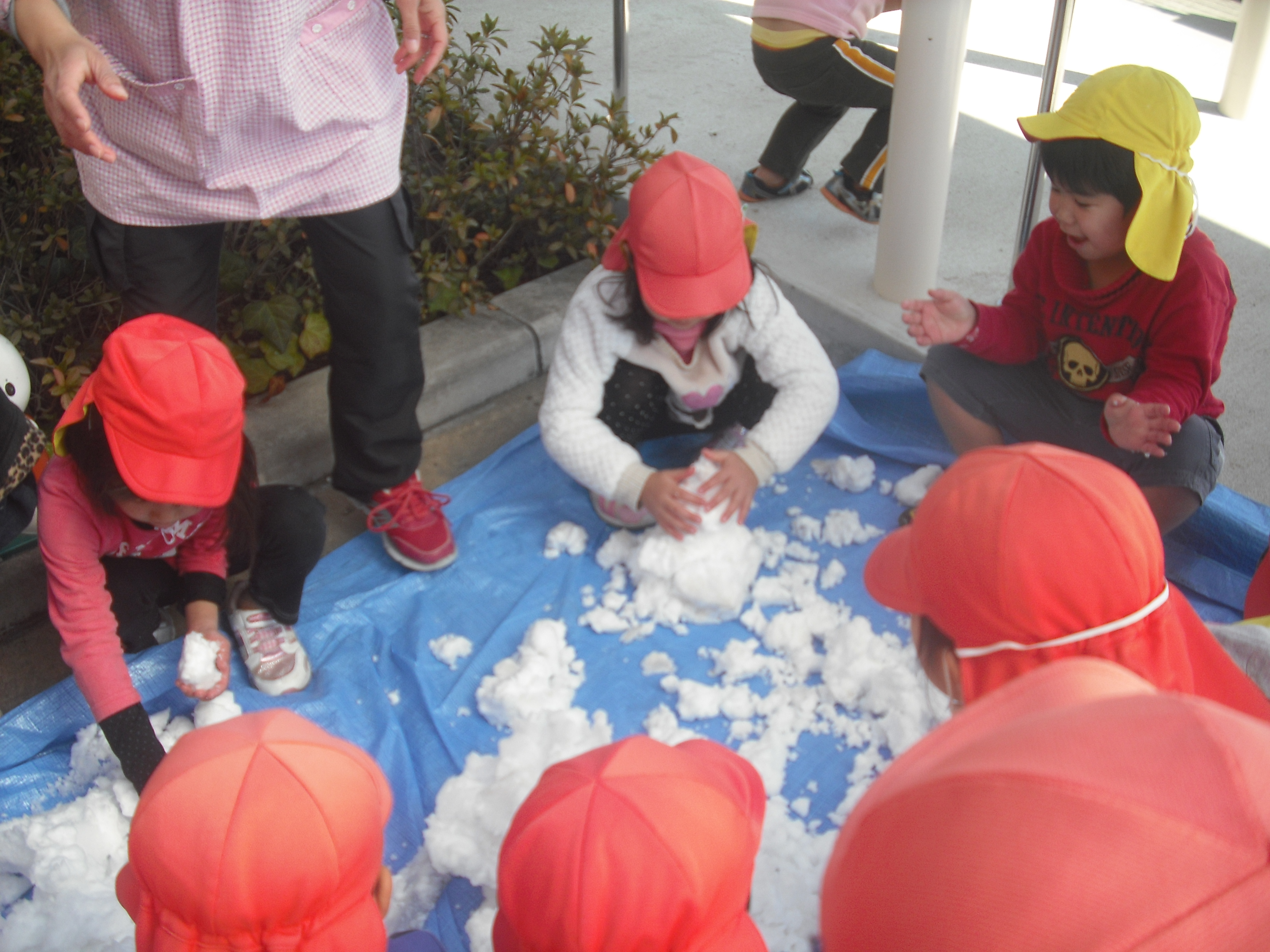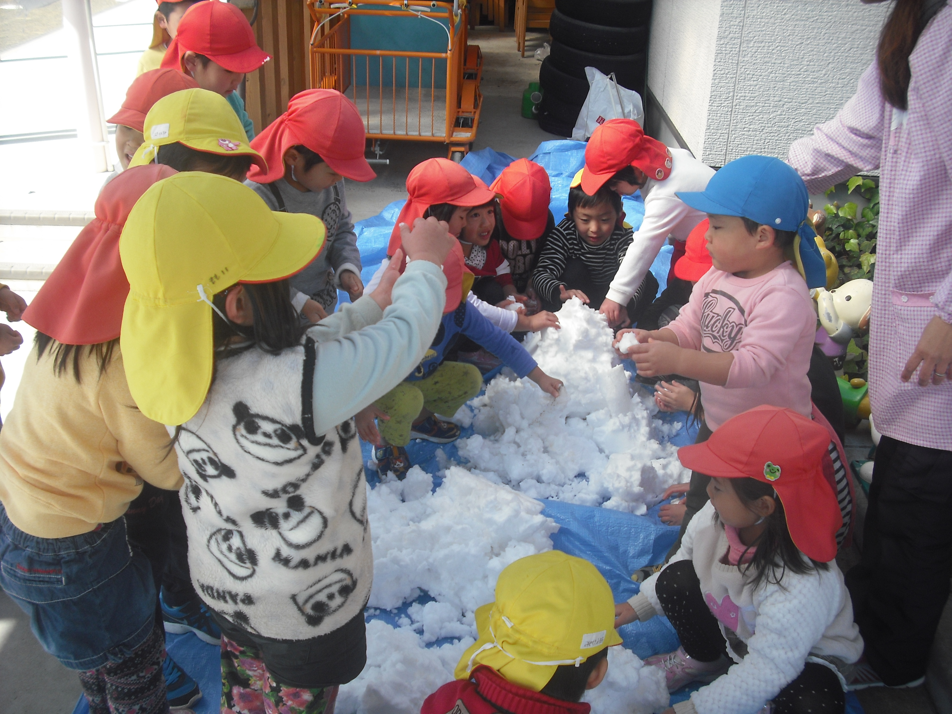 子ども達は雪に大はしゃぎ。『冷た~い』と言いながら感触を楽しんだり、お城を作ったり、雪合戦をしたりと雪がとけてなくなるまで楽しいひとときを過ごしました。
