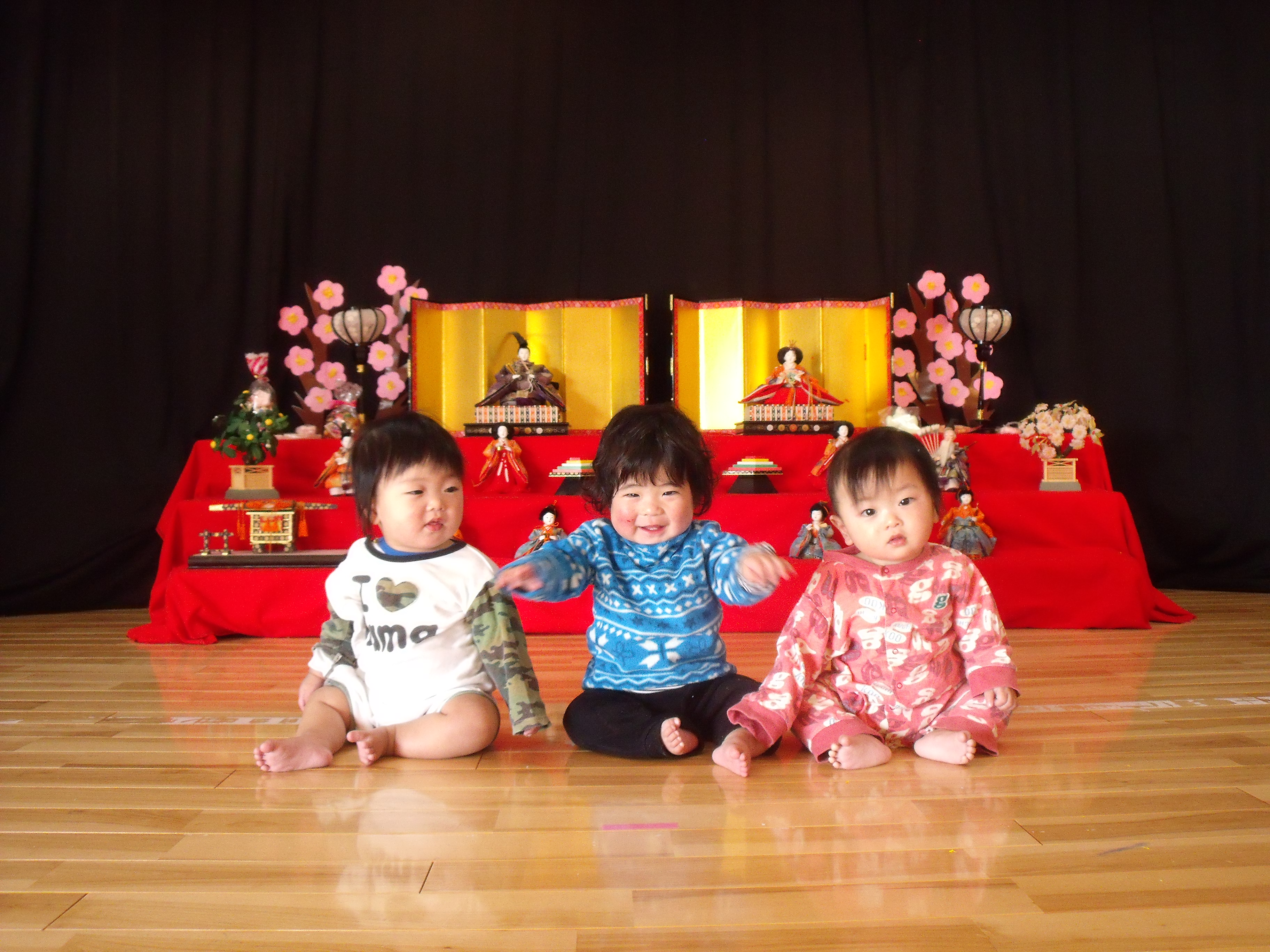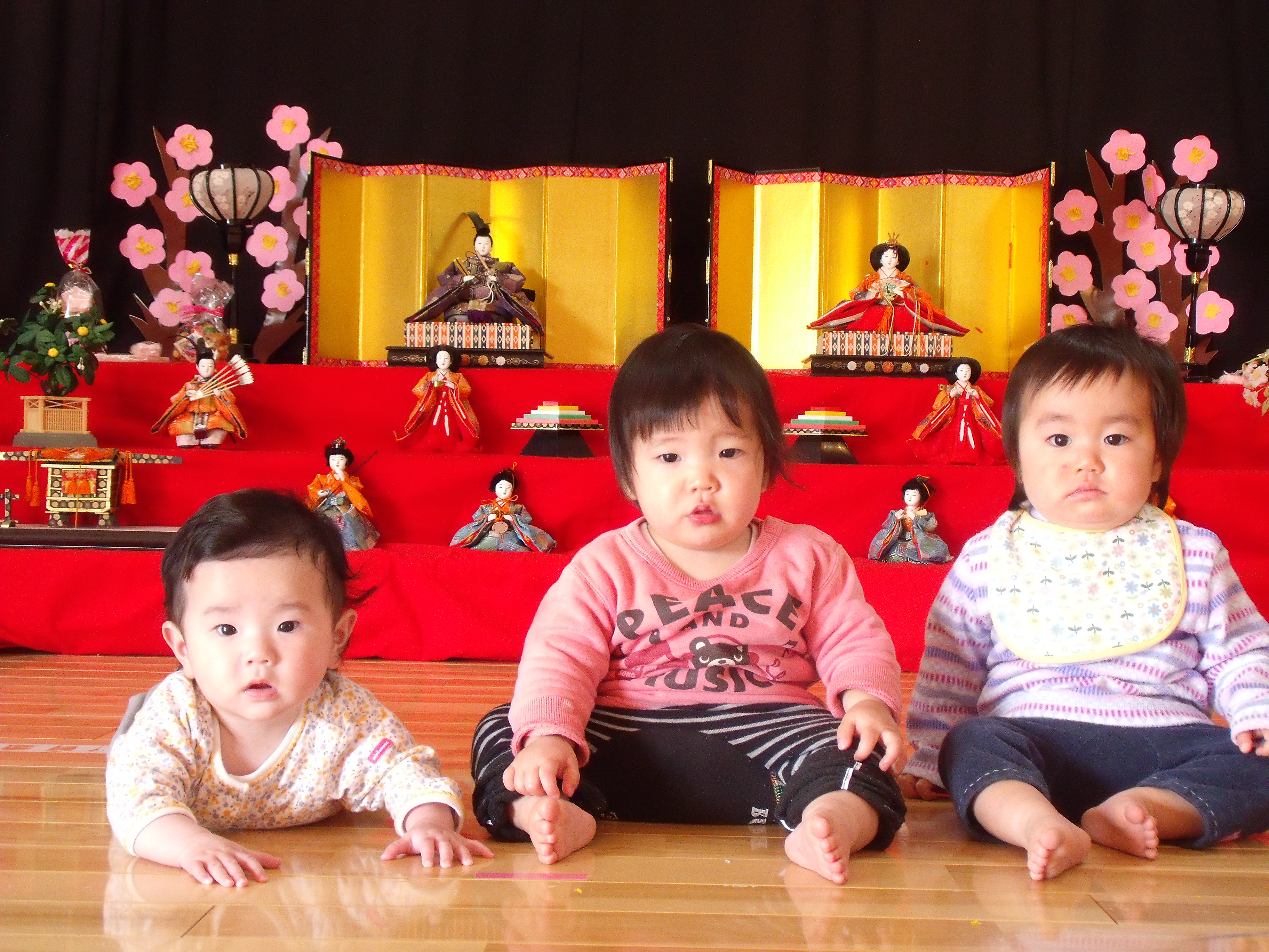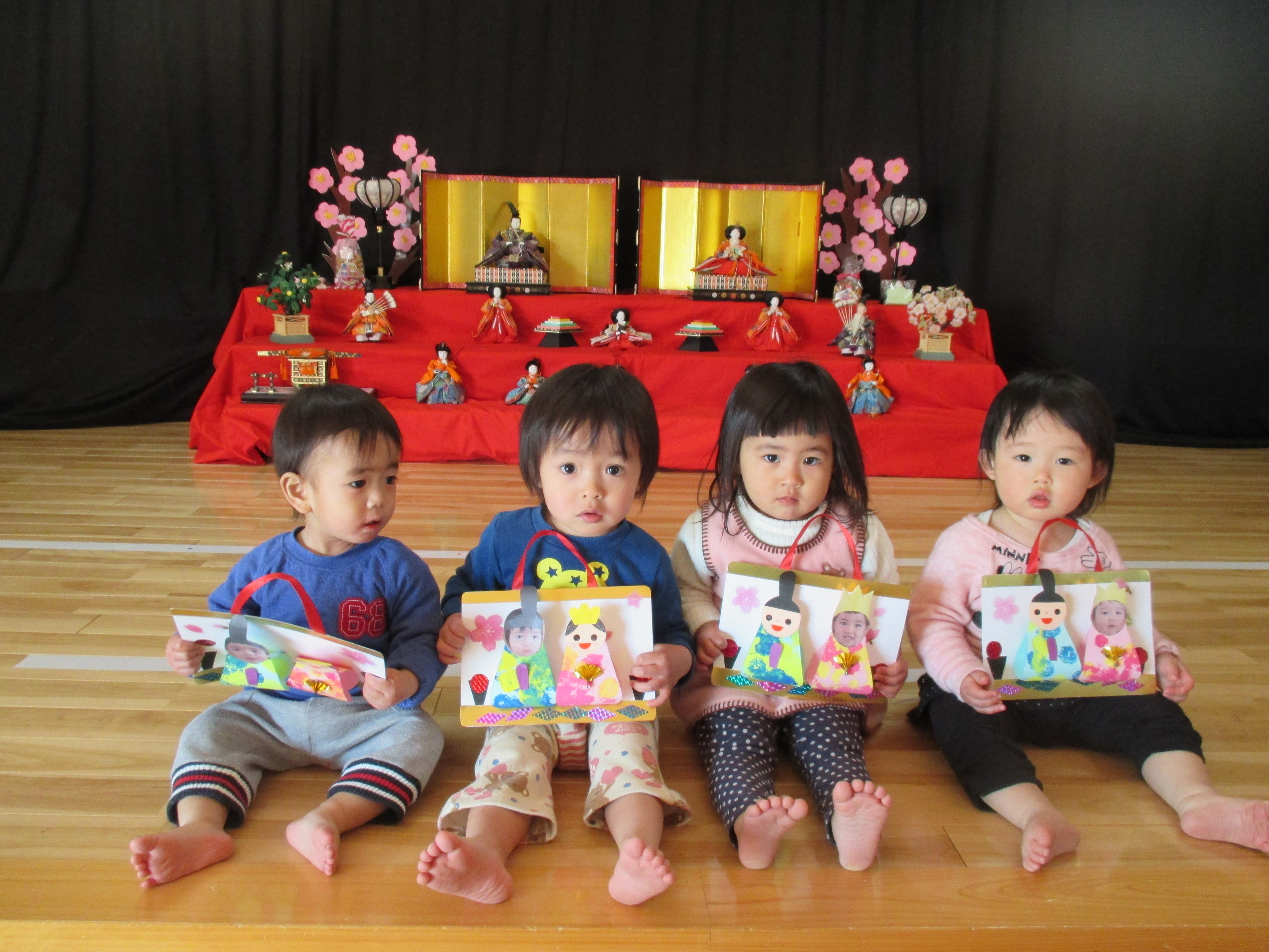 雛人形 3月1日(火) 桃の節句ですね。 子ども達に災いが降りかからない様に、人生の幸福が得られる様に・・・という気持ちを込めて雛人形を飾りました。 各クラスで、健やかな成長と幸せを願い記念撮影で~す。
